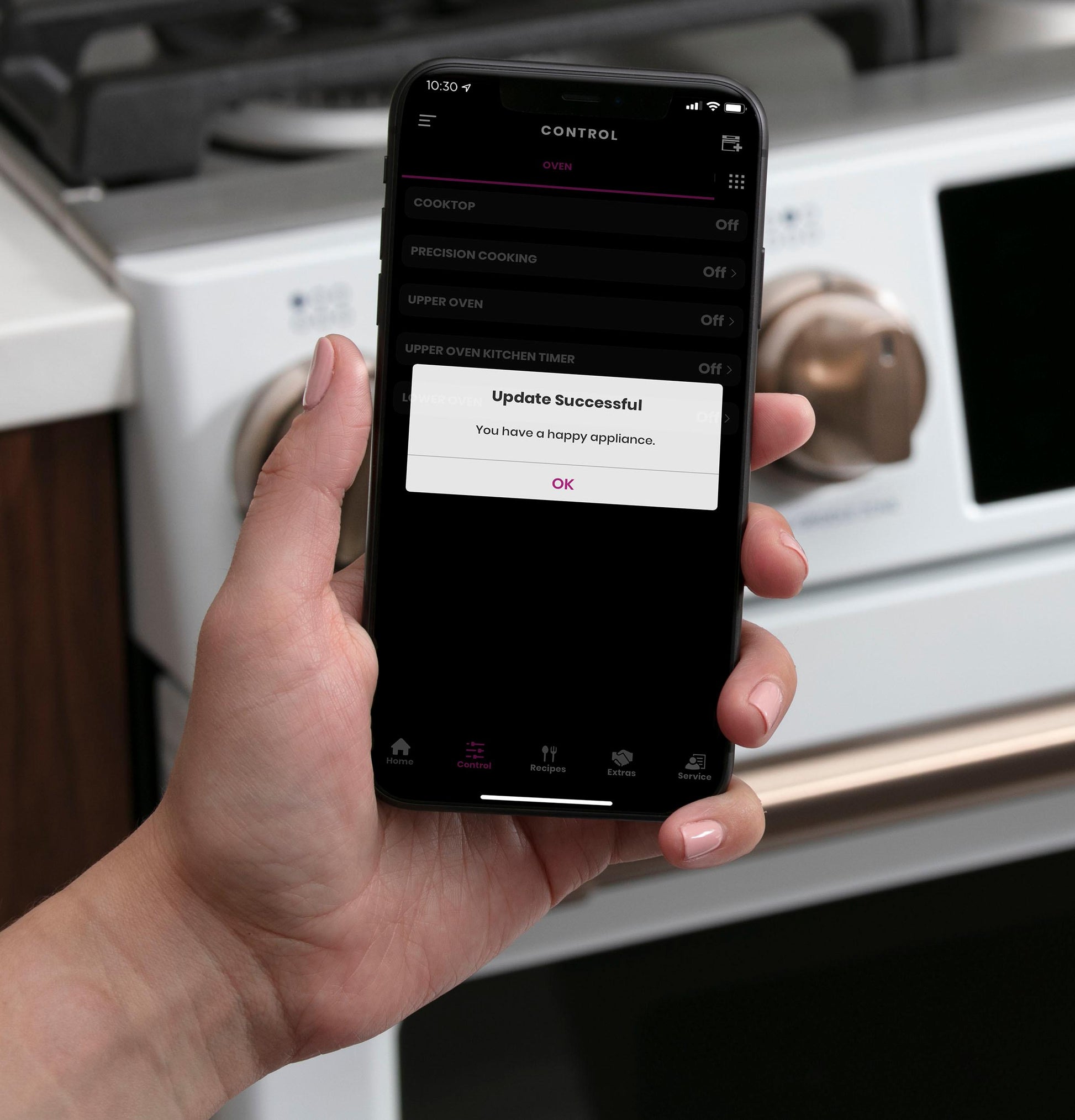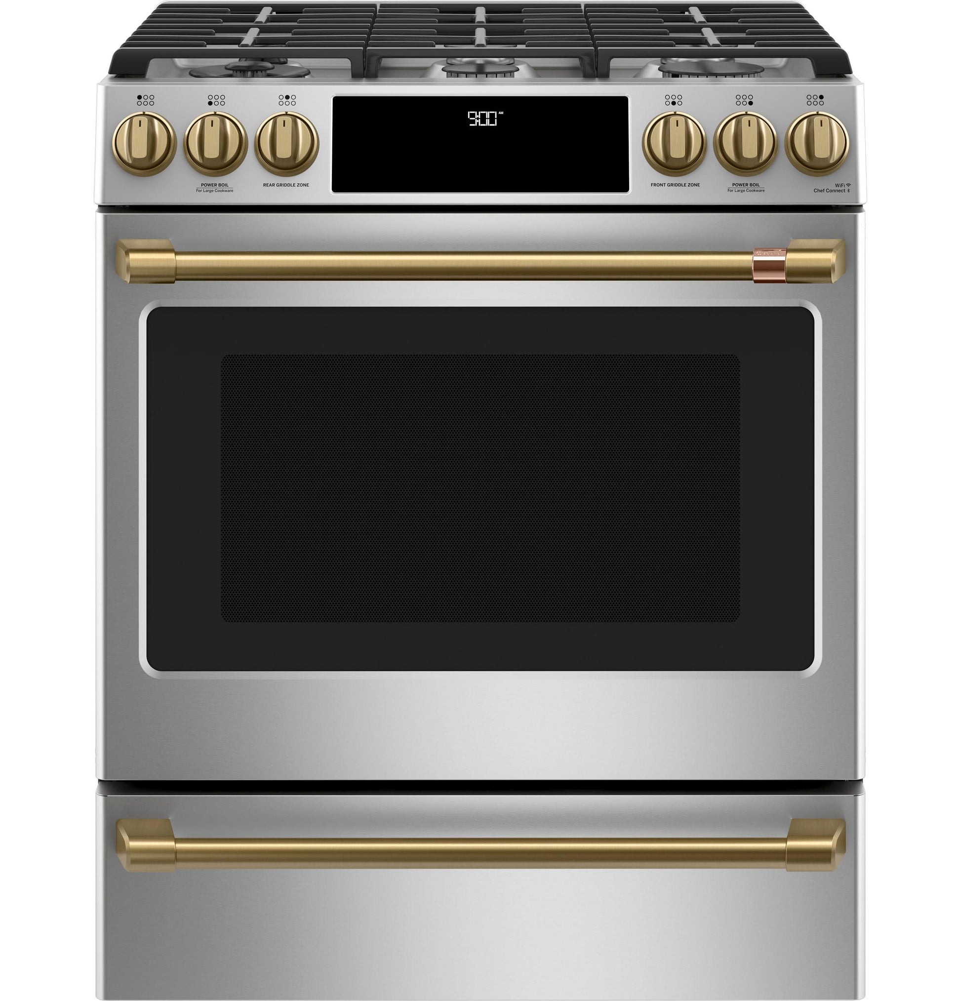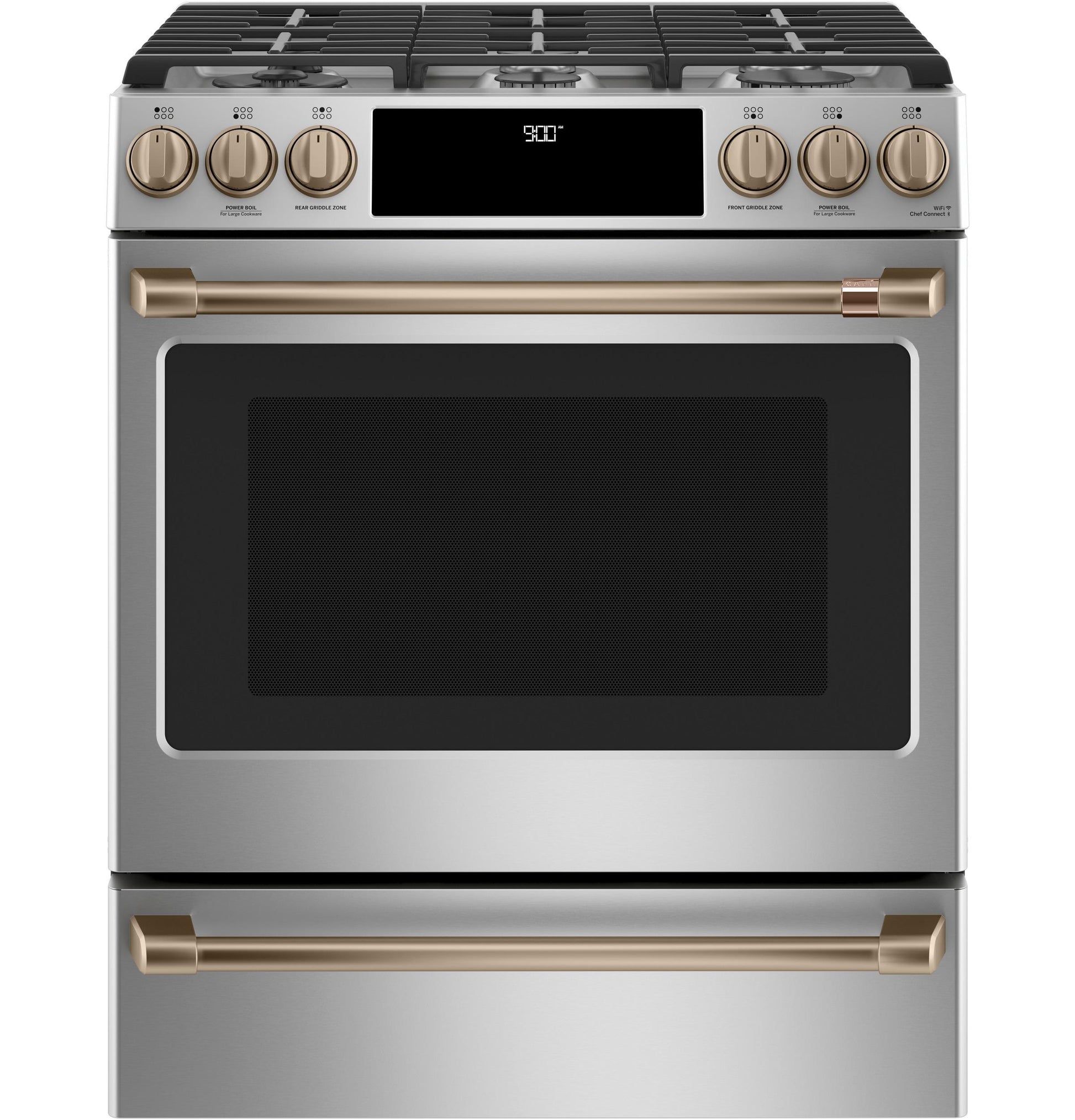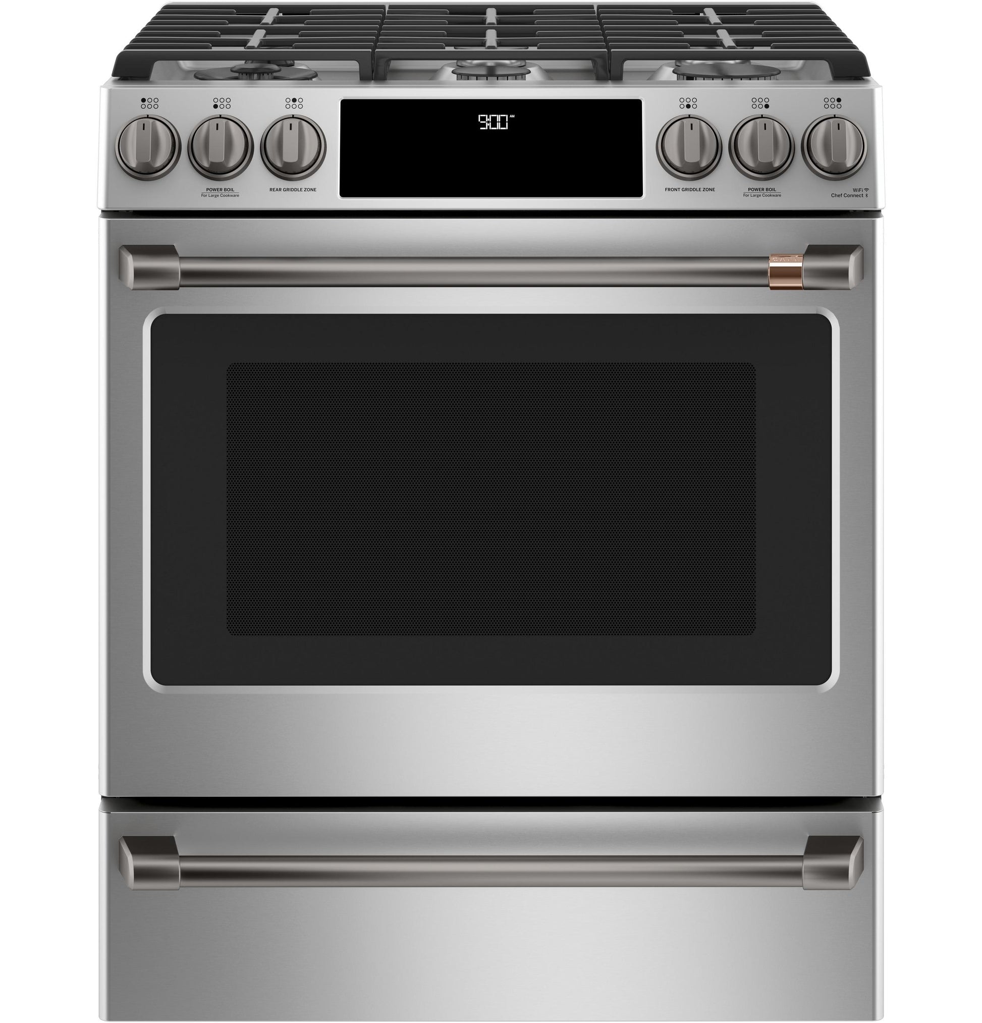 Elevate your culinary endeavors with the Café™ 30" Smart Slide-In, Front-Control, Dual-Fuel Range with Warming Drawer (model C2S900P2MS1). This range unites the power of a gas cooktop with the precision of an electric oven. The industry's first edge-to-edge cooktop with six versatile burners accommodates cookware of all sizes and includes an integrated cast-iron griddle for preparing large meals and family favorites. The oven's True European Convection with Precise Air ensures even baking and roasting results every time. Built-in WiFi, powered by the SmartHQ™ App, allows you to manage all aspects of your kitchen with your voice assistant or smart device. You can also download cooking upgrades, such as No-Preheat Air Fry, directly to your oven. The sleek backlit glass touch control panel visually disappears when not in use and wakes up when prompted, adding a touch of elegance to your kitchen. Additional features include a 21K triple ring burner for searing and simmering, a 15K power boil burner for rapid boiling, and a temperature probe to monitor roasts and meats without opening the oven door. The range also offers Chef Connect, which synchronizes your appliance clocks and surface lights with other compatible Café appliances for a chef-like experience.