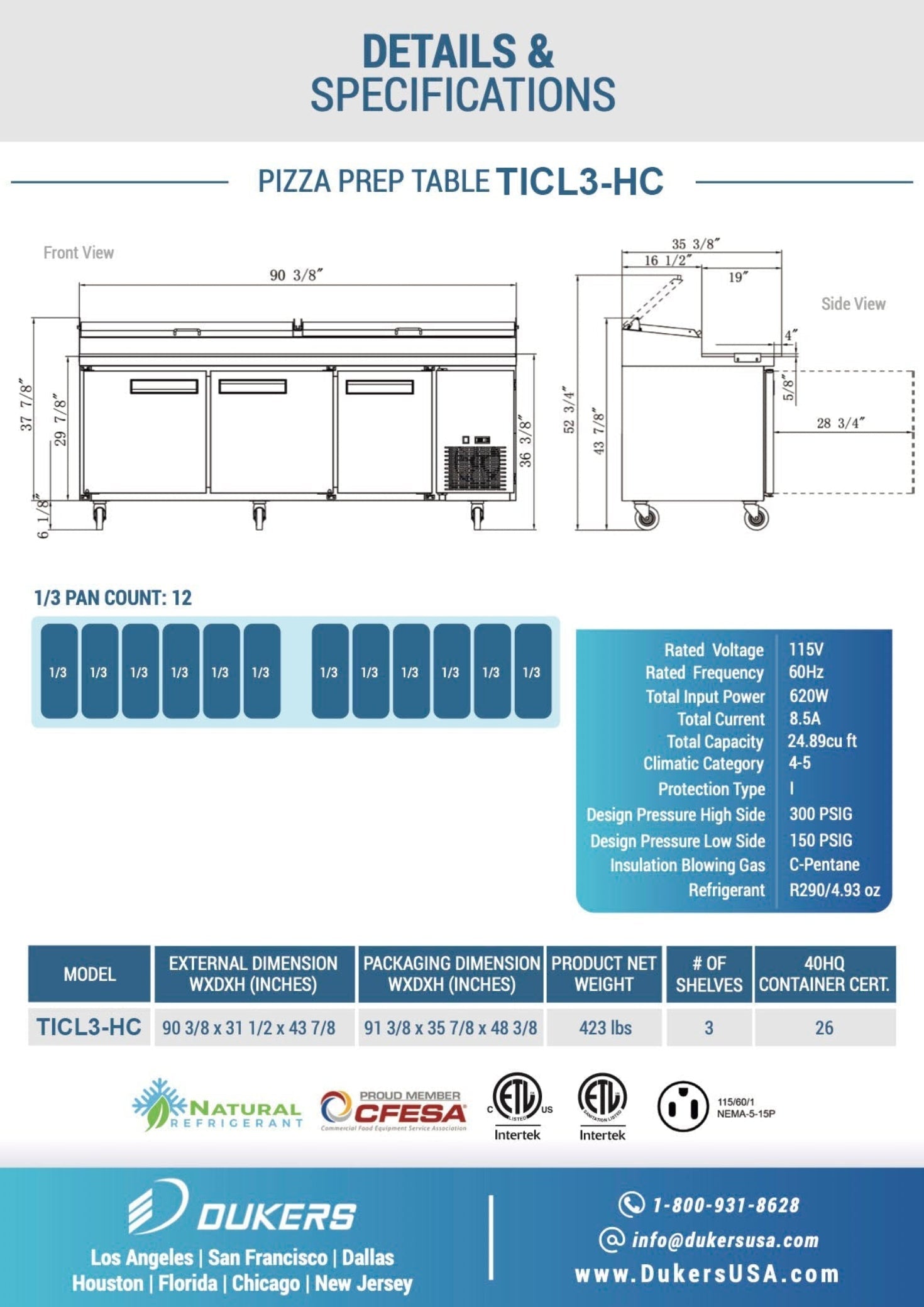 The Chef AAA - TICL3-HC commercial pizza prep table is constructed of heavy duty stainless steel to be durable and resilient to harsh kitchen environments. Keeps toppings and ingredients insulated with a hinged cover. Includes 12 1/3 pan containers to keep food organized and ready to use. The bottom conveniently holds additional items with 3 removable wire shelves that can be adjusted. With a range of 33°F to 41°F, it chills and safely stores all type of food. Digital temperature controls and LED display lets you precisely pick the desired temperature. Designed with a bottom mounted 1/2 HP compressor for efficiency.