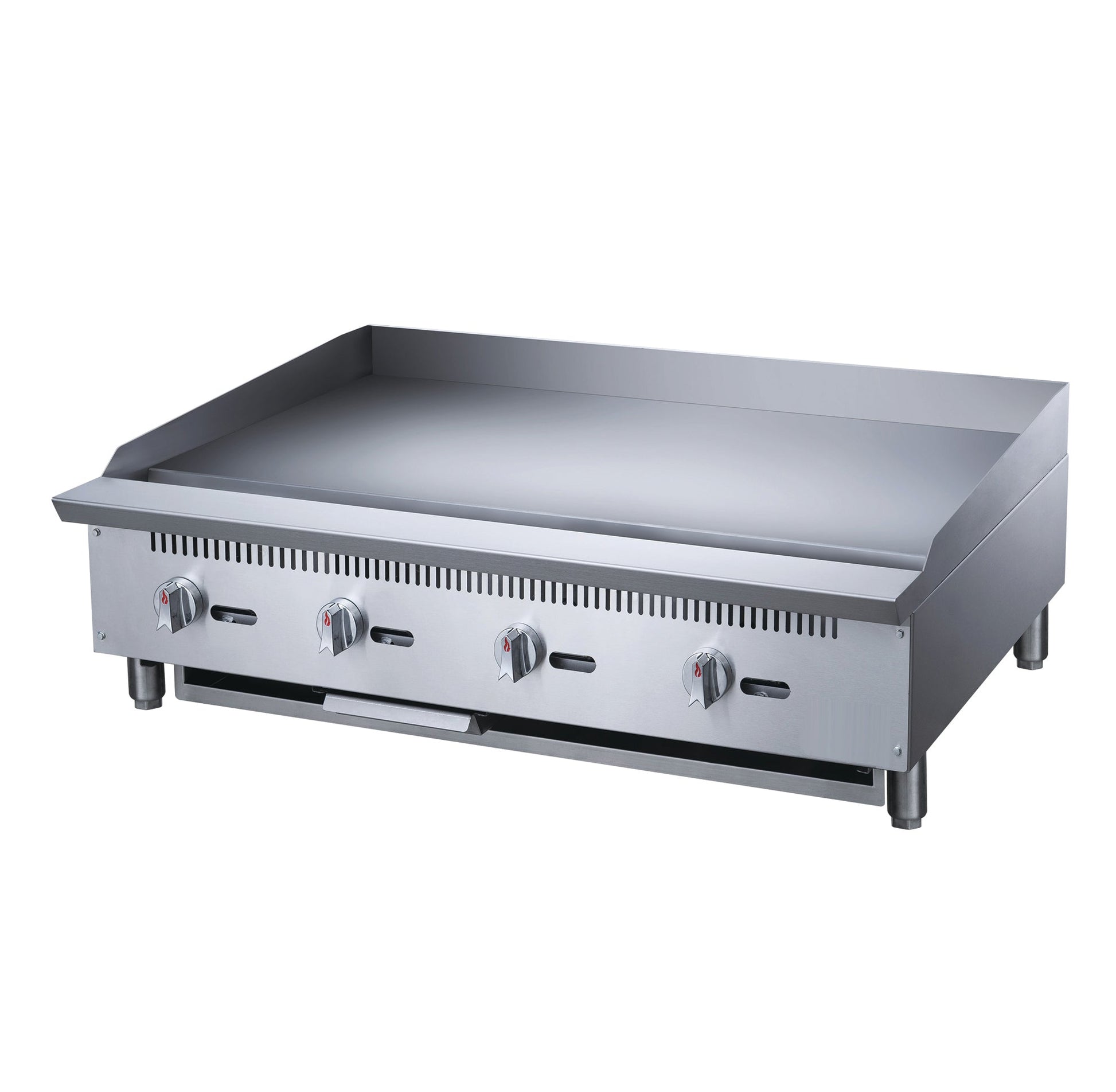 The Chef AAA TCGM48 48-inch W Griddle with 4 Burners is a professional-grade cooking appliance designed for high-performance cooking in commercial kitchens. With four powerful burners delivering a combined output of 120,000 BTU/H, this griddle ensures efficient and even heat distribution for consistent results. It is compatible with both Natural Gas (NG) and Propane, offering versatility in installation. The generous work area, measuring 47.86" x 20.50", provides ample space for preparing large quantities of food, making it suitable for high-volume cooking environments. Constructed with a robust stainless steel exterior and interior, it ensures durability and easy cleaning. Featuring independent manual controls and adjustable stainless steel legs, operators have precise control and stability during use. Each unit comes with a heavy-duty 3/4โ thick polished steel griddle plate and a full-length seamless drip pan, facilitating effortless maintenance. Additionally, it includes a 1-year parts and labor warranty, providing assurance of quality and reliability.