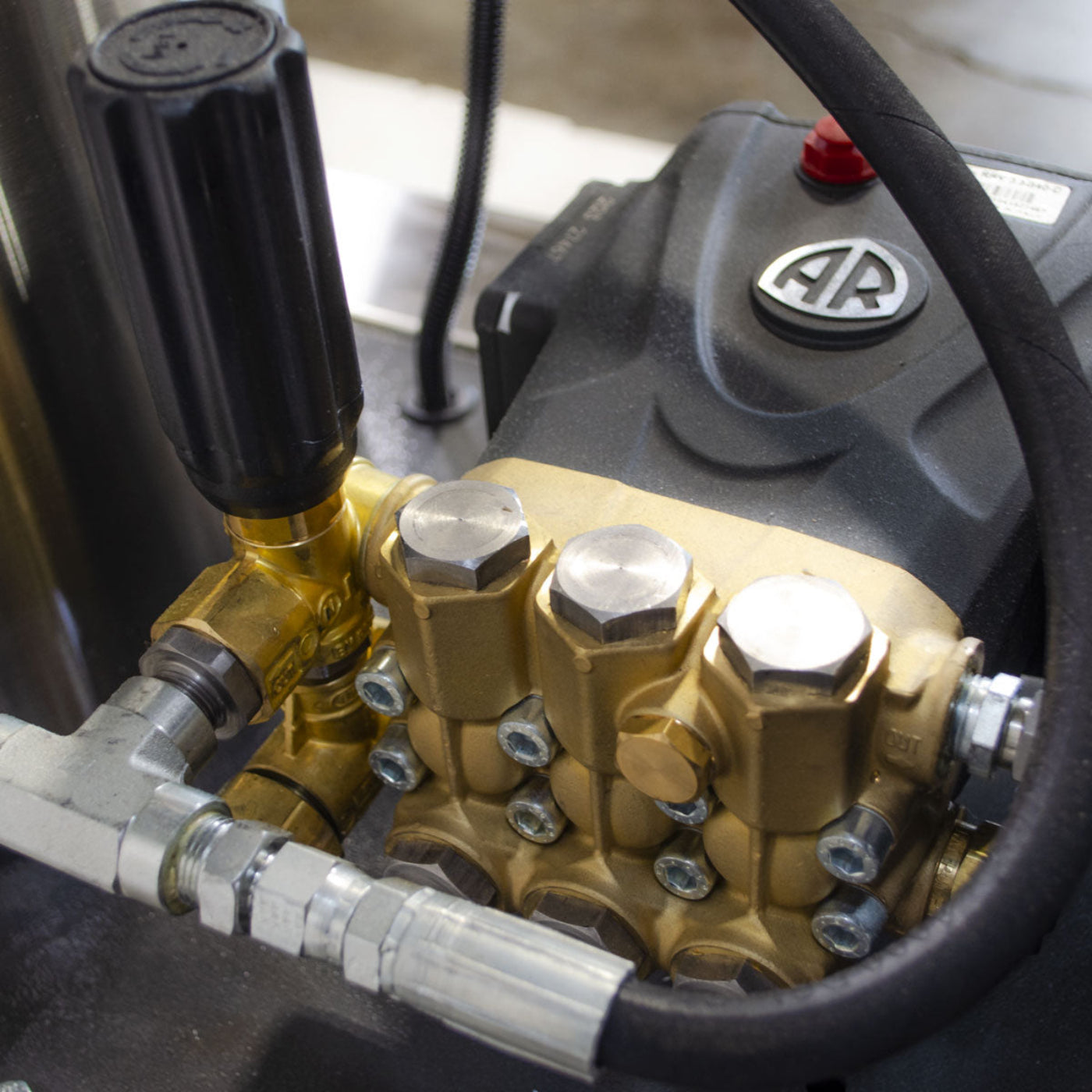 The four-wheeled pressure washer cart features a pull start, direct drive, 10 HP Vanguard engine from Briggs & Stratton, an oil-fired, fuel conserving, high-efficiency burner (240,000 BTU), as well as a Triplex ceramic plunger pump with 3.5 gallons per minute (GPM) and 3000 pounds per square inch (PSI) ratings. In addition, the CleanFreak #3530G utilizes a fuel-efficient, stainless-steel combustion chamber, providing durable protection for sustained optimal unit performance. The exclusive vertical fire coil design (ASTM A53 Schedule 80 Steel Heating Coil) enables efficient and rapid water heating capability. The adjustable temperature control dial feature allows for precise temperature control, which is great for achieving that “just right” application of temperature, water, and/or cleaning solution (for which there is a downstream chemical injection feature) depending on the specific dirty job at hand.