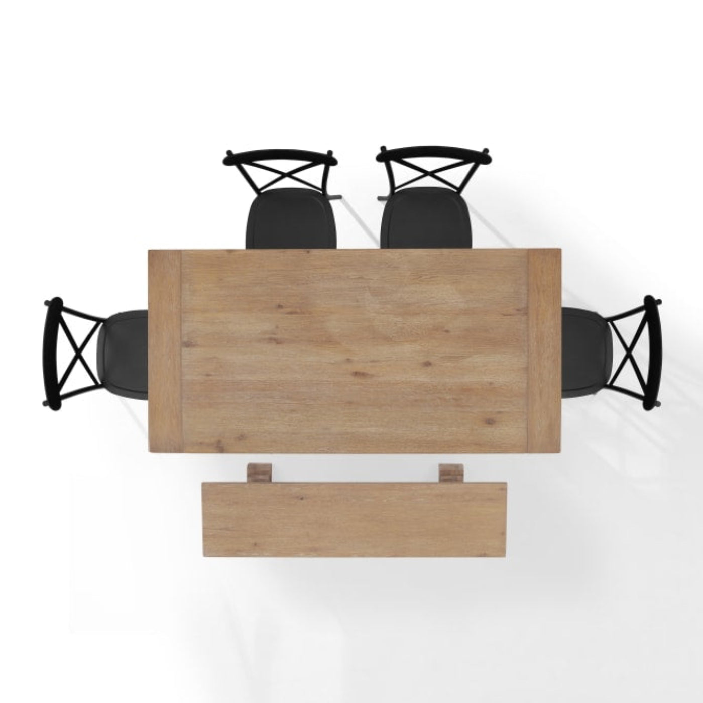 A: Its rustic wood finish and matte-black chairs complement farmhouse, industrial, and modern transitional interiors.