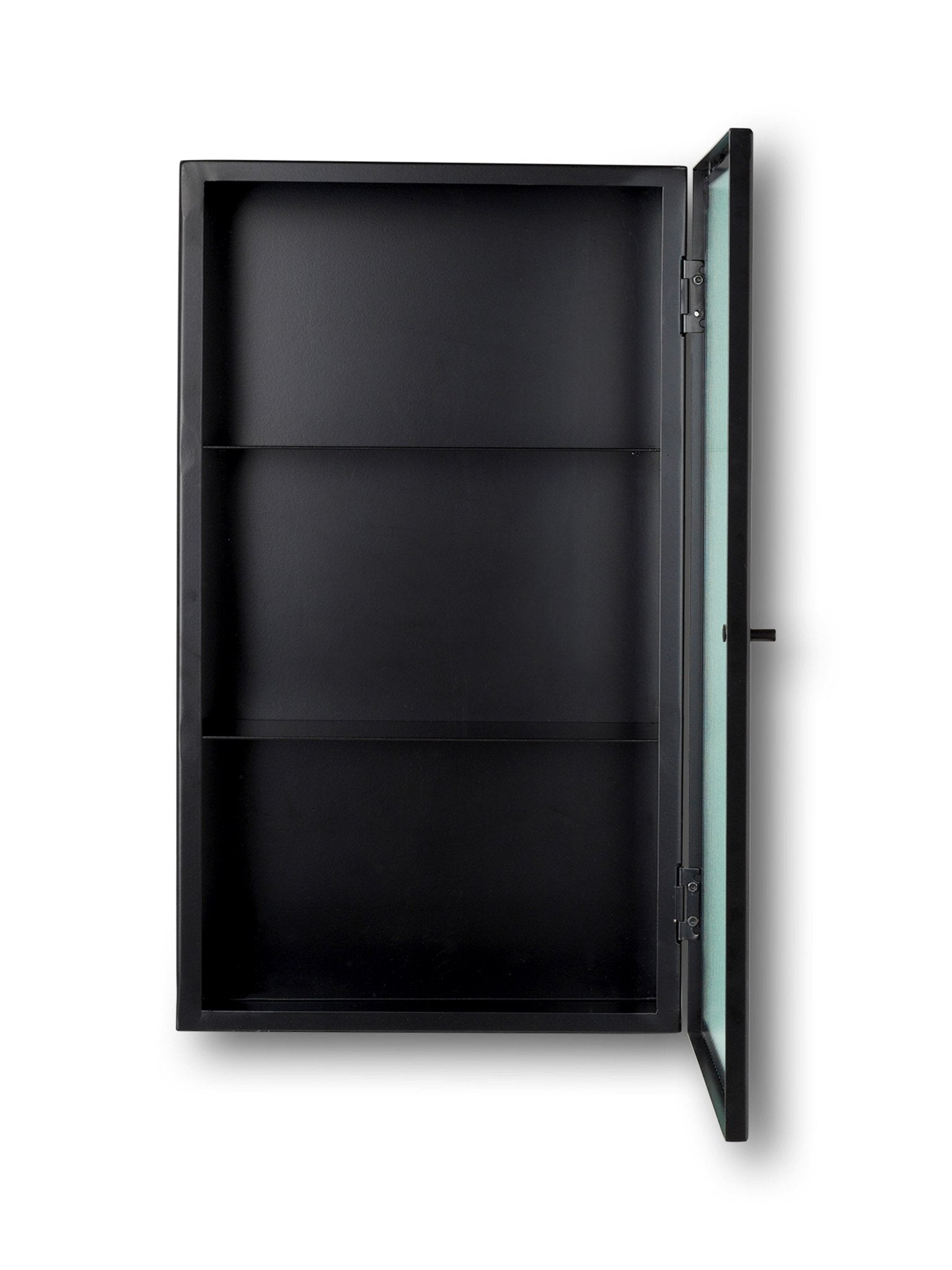 A: A wall-mounted storage cabinet ideal for organizing and displaying small items in kitchens, bathrooms, or hallways.