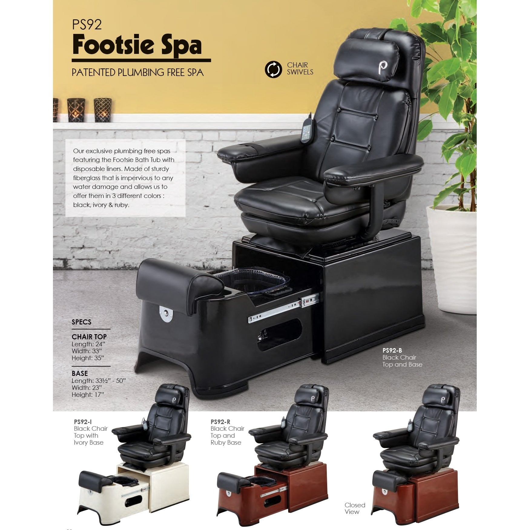 Pibbs PS92 Fiberglass Footsie Pedicure Spa is Made in the U.S.A. with a high durability fiberglass shell and it does not require plumbing to operate. This Pedicure unit features the Footsie Footbath which is ultra-lightweight, extra deep, has double heating elements and superior vibration. The Footsie Footbath features disposable, ultra-hygienic liners that require no cleaning and no chemicals. Â There is also an adjustable footrest that makes it easy for both the technician and the client. This Pedicure Chair is available in multiple color combinations with 6 vibrant colors to chose from.
