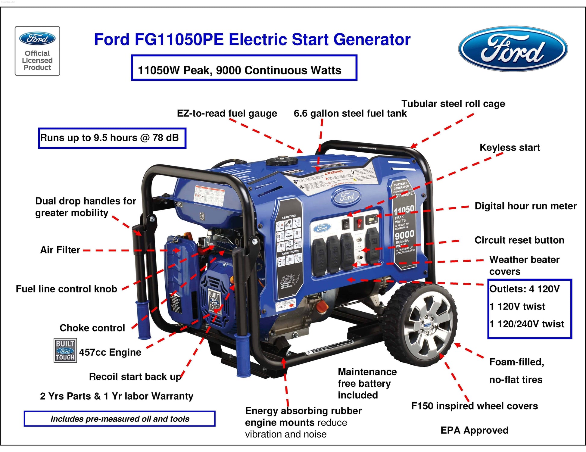The Ford Generator 11050PE combines a powerful 457cc, 4-stroke, OHV engine and a heavy-duty powder coated steel M-Frame design, making it a rugged and reliable Ford portable generator for any job. Featuring (4) 120V 20A outlets, (1) 120V 30A twist-lock outlet, and (1) 120/240V 50A RV outlet for powering a variety of tools, devices, and even major appliances. The electric push start makes getting up and running quick and hassle-free, and the convenient fold-down handles and 10" never-flat wheels with F-150 inspired rims provide optimal portability. With an extended 10.5 hour run-time on just 6.6 gallons of fuel, it's easy to see that the FG11050PE is truly "Built Ford Tough." This generator ensures you have all the power you need, whether for residential backup, commercial use, or outdoor activities.