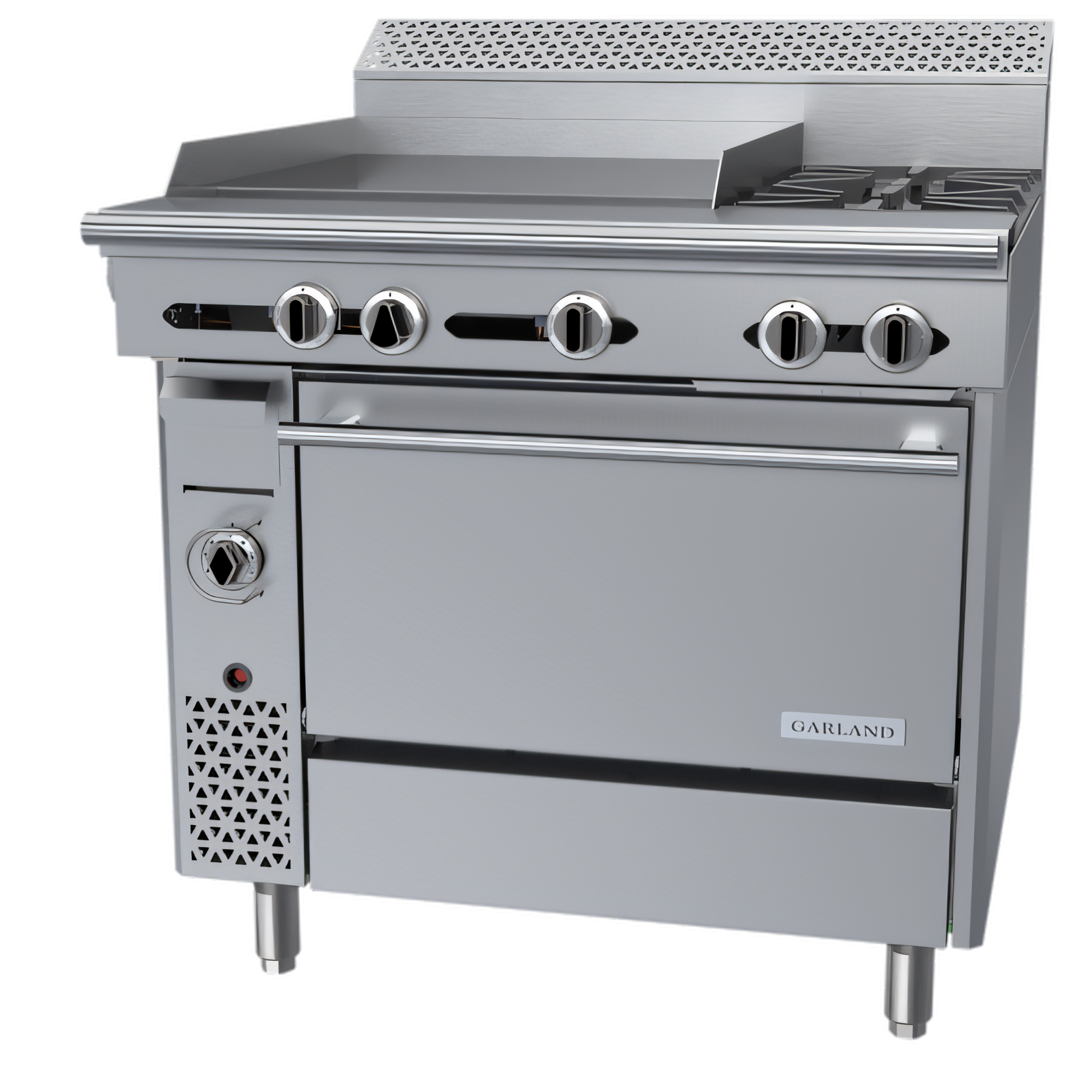 Built for the busiest commercial kitchens, the Garland Cuisine Series model C36-2-1R packs serious power and versatility into only 36 inches of line space. With two ultra-powerful Starfire burners on the right, a precision-controlled 24 inch griddle on the left, and a full-size oven below, this single piece of equipment does the work of three—keeping your cookline compact and productive.