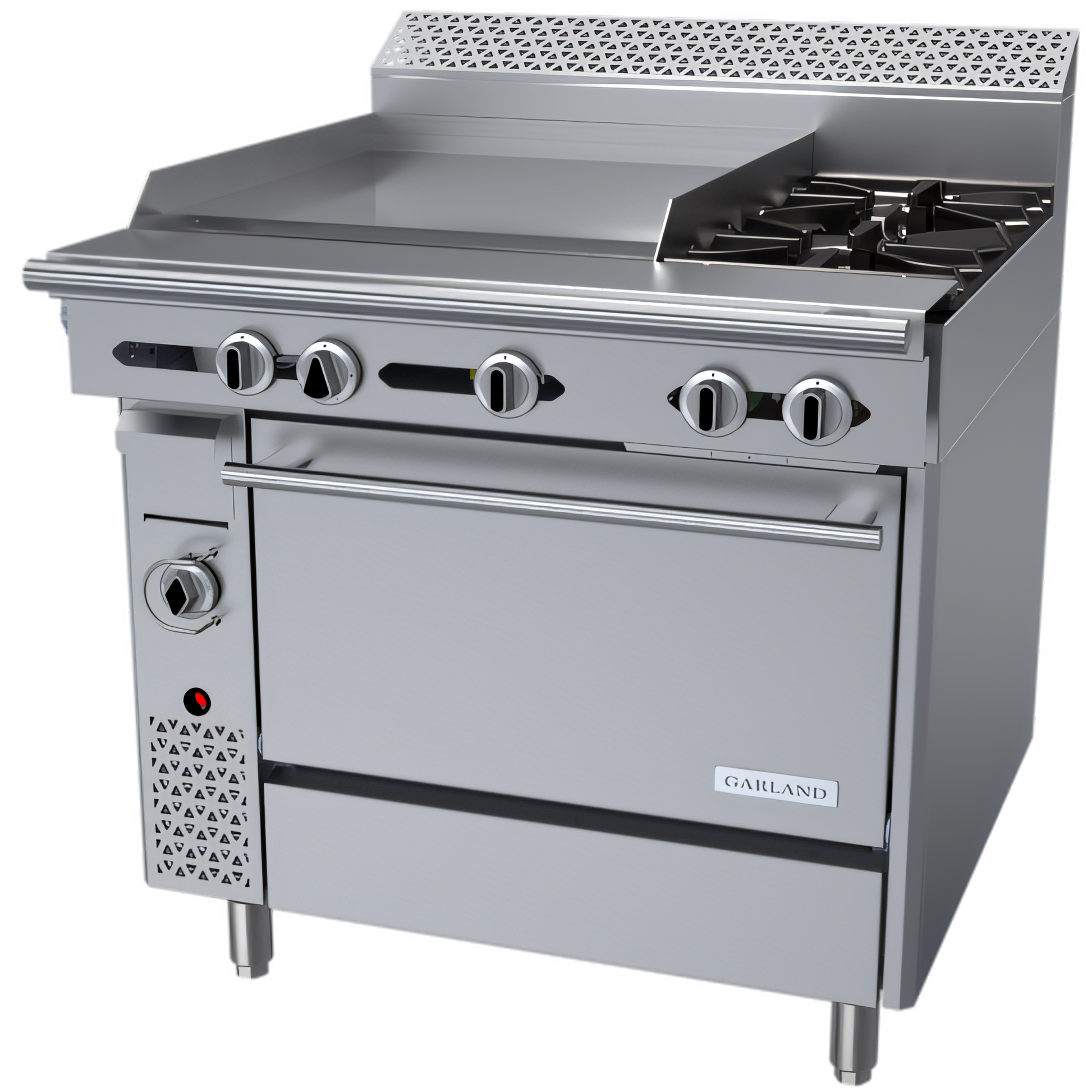 Engineered for high-volume, all-day production, the Garland Cuisine Series combination range marries the searing power of a 24" griddle with two 35,000 BTU Starfire open burners and a full-size standard oven – all in a space-saving 36" footprint. Built from the ground up for demanding commercial kitchens, this single piece of equipment lets you grill, sauté, boil and bake without missing a beat.