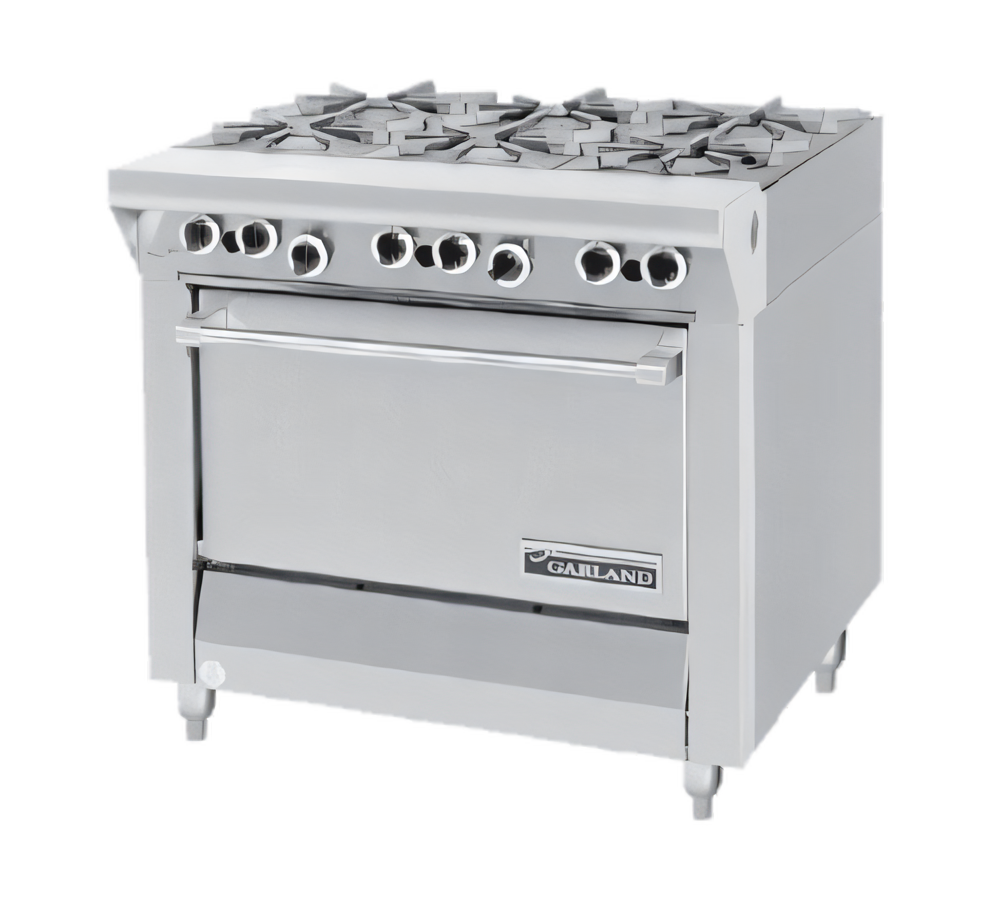 A: A heavy-duty commercial gas range with six open burners and one standard oven, designed for high-volume cooking environments.
