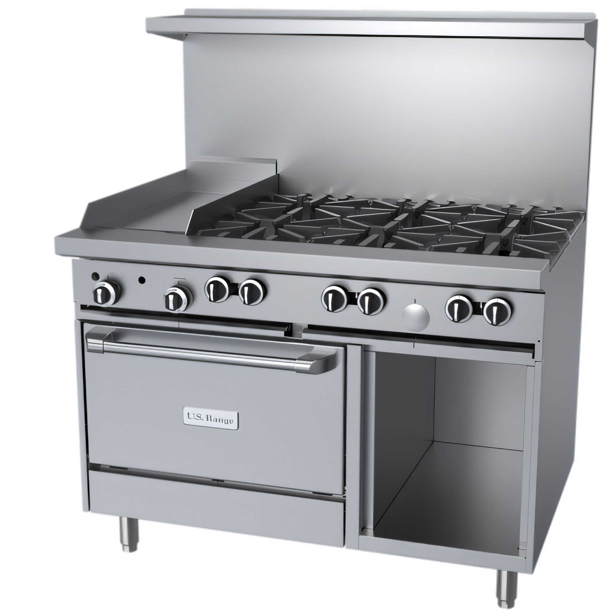 Powerful, All-Purpose Cooking Configuration: Combines six 32,000 BTU open burners, a 12″ griddle with heavy 5/8″ steel plate, a standard oven, and a storage base — providing burners, griddle, baking/roasting, and storage in a single 48″ unit.