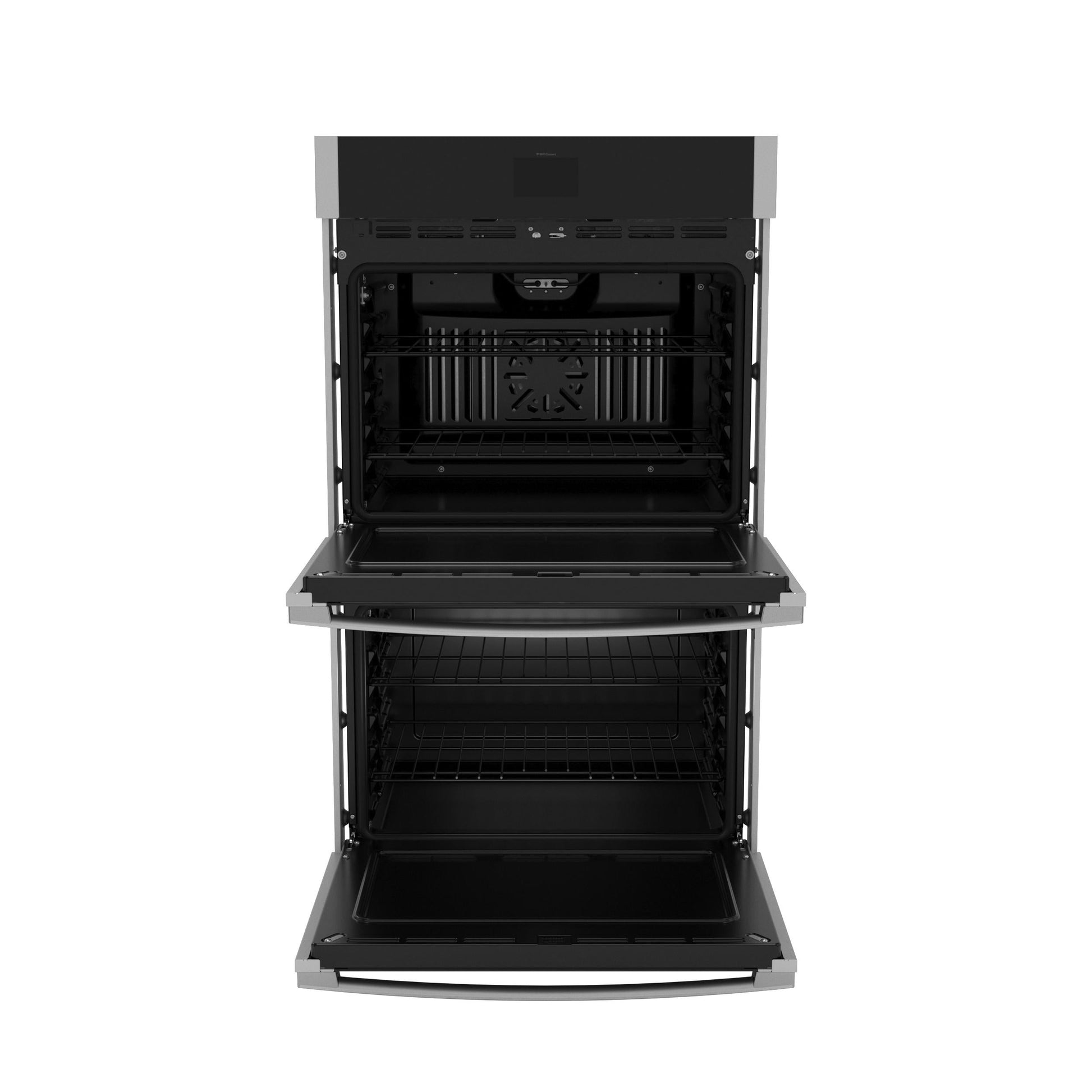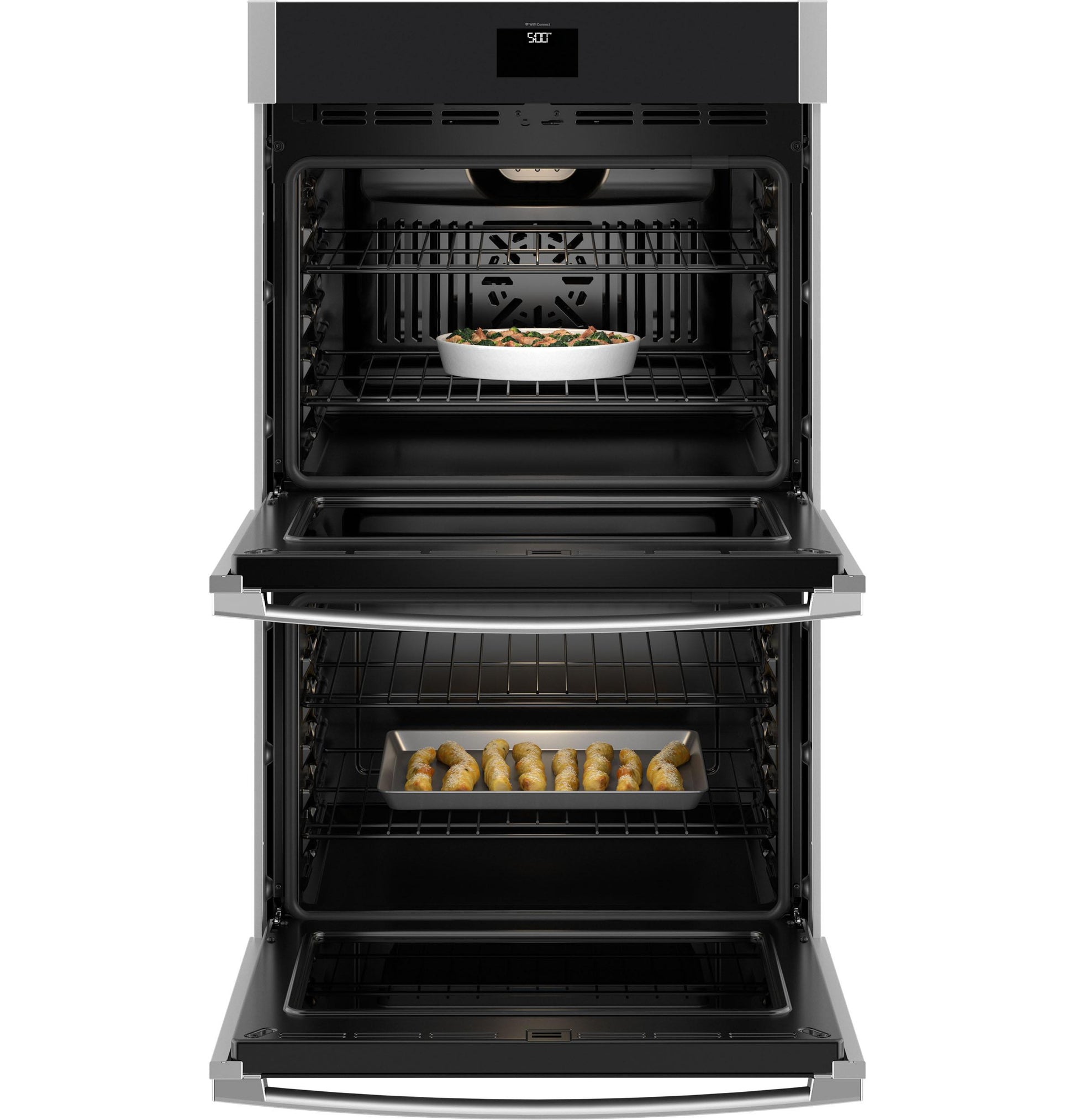 A: The JTD5000SVSS features a self-cleaning convection oven, No Preheat Air Fry for crispy results, and smart connectivity for remote control. It offers dual ovens for versatile cooking options.