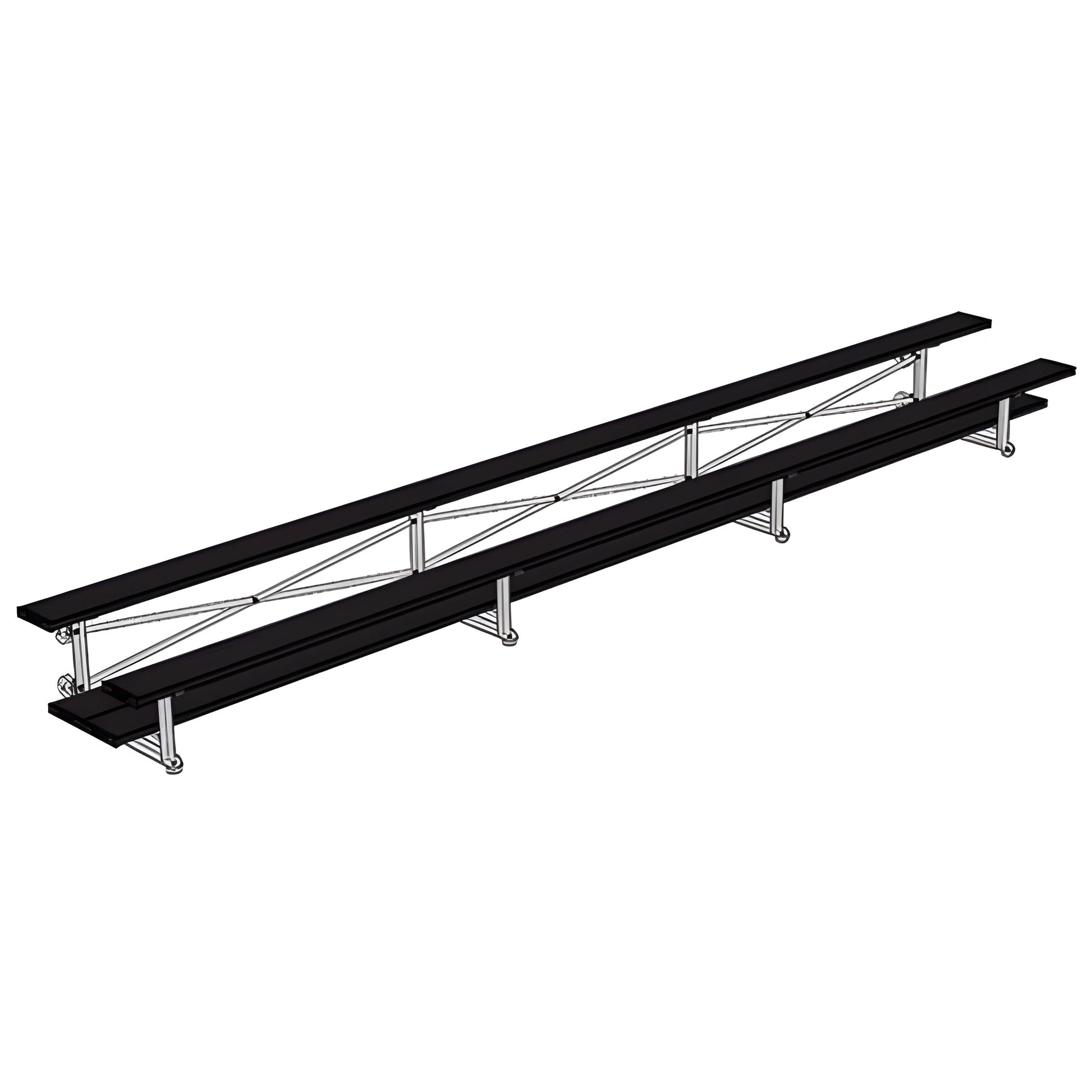 A: These 21' tip & roll bleachers feature a 2-row double-foot plank design with a durable aluminum frame, making them easy to transport and store.