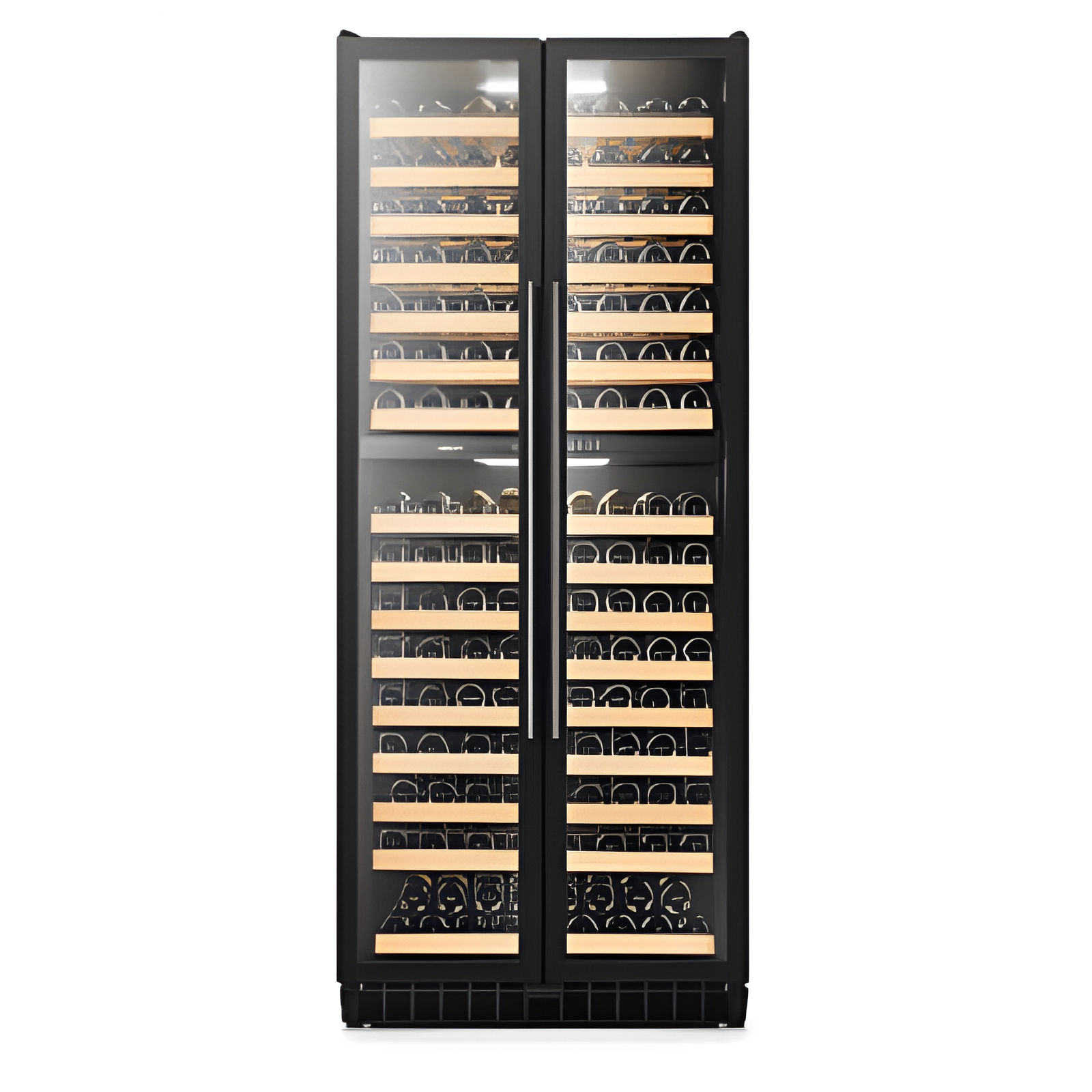 The LanboPro 287 Bottle Dual Door Wine Cooler - LP328D offers an expansive storage solution for avid wine collectors, with the capacity to hold up to 287 standard 750ml Bordeaux bottles. This impressive wine cellar features digital touch controls for precise temperature management, with separate zones allowing for 46°F-54°F in the upper zone and 54°F-64°F in the lower zone, ensuring your wines are kept at their ideal serving temperatures. Soft LED lighting showcases your collection without compromising the integrity of the wines, and the lighting automatically shuts off after 10 minutes to conserve energy.