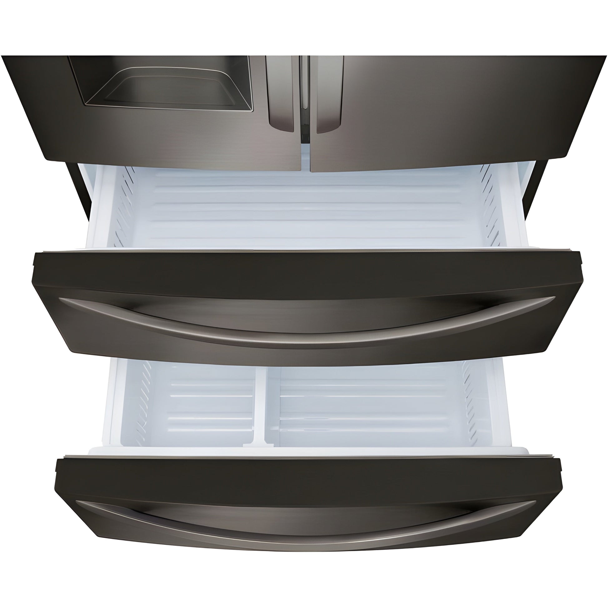 A: This spacious 30 cu. ft. refrigerator features a 4-door design, advanced cooling technologies, and a sleek black stainless steel finish, providing ample storage and modern style.