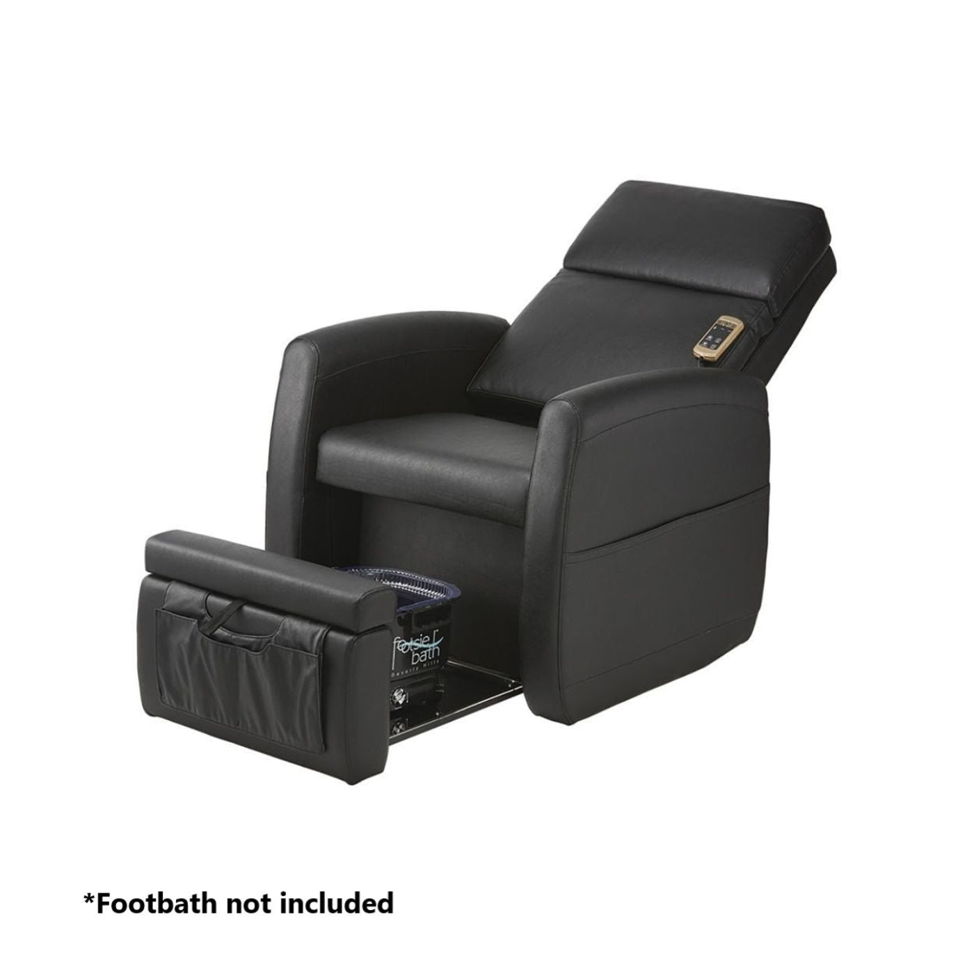 A: It features a built-in footbath with pipeless jet technology, a reclining lounge chair, and removable tub liners for easy sanitation.