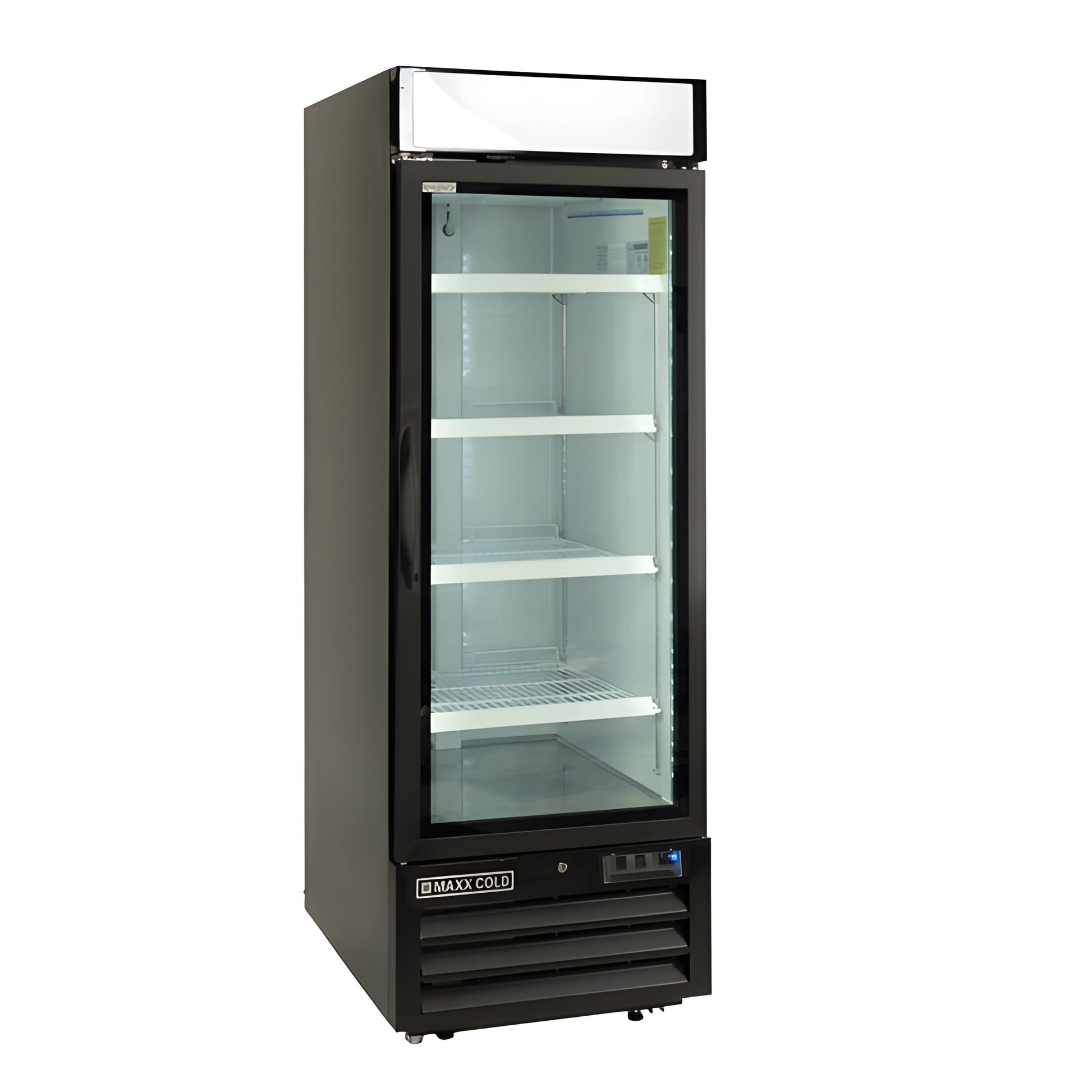 The Maxx Cold V-Series Single Glass Door Merchandiser Refrigerator is a valuable asset for commercial establishments looking to showcase refrigerated products in a visually appealing way. This cost-effective commercial merchandiser refrigerator measures 27"W and has a capacity of 23 cubic feet. It is constructed of a powder-coated steel exterior and a powder-coated aluminum interior. The unit has an easily accessible bottom mount for cleaning. This commercial merchandiser fridge has one double-pane insulated glass door that allows customers to see the contents easily without opening the doors. The unit has four adjustable heavy-duty PE-coated wire shelves that are ideal for displaying various refrigerated items such as soft drinks, dairy products, sandwiches, salads and more. Interior LED lighting illuminates the contents of the merchandiser, enhancing product visibility and presentation. The single-door merchandiser refrigerator is equipped with four rollers (two with leveling feet) for easy mobility. The unit features digital controls with an LED temperature display and is designed to maintain a temperature of 33°F to 41°F (1°C to 5°C), ensuring your products are stored at the optimal temperature for quality and safety. This merchandiser features an automatic defrost system which helps to minimize maintenance. To help increase sales, the illuminated top panel is ideal for advertising and promoting your products in various settings such as supermarkets, convenience stores, gas stations, cafes and more. The Maxx Cold V-Series Single Glass Door Merchandiser Refrigerator is a cost-savvy choice for your commercial establishment.