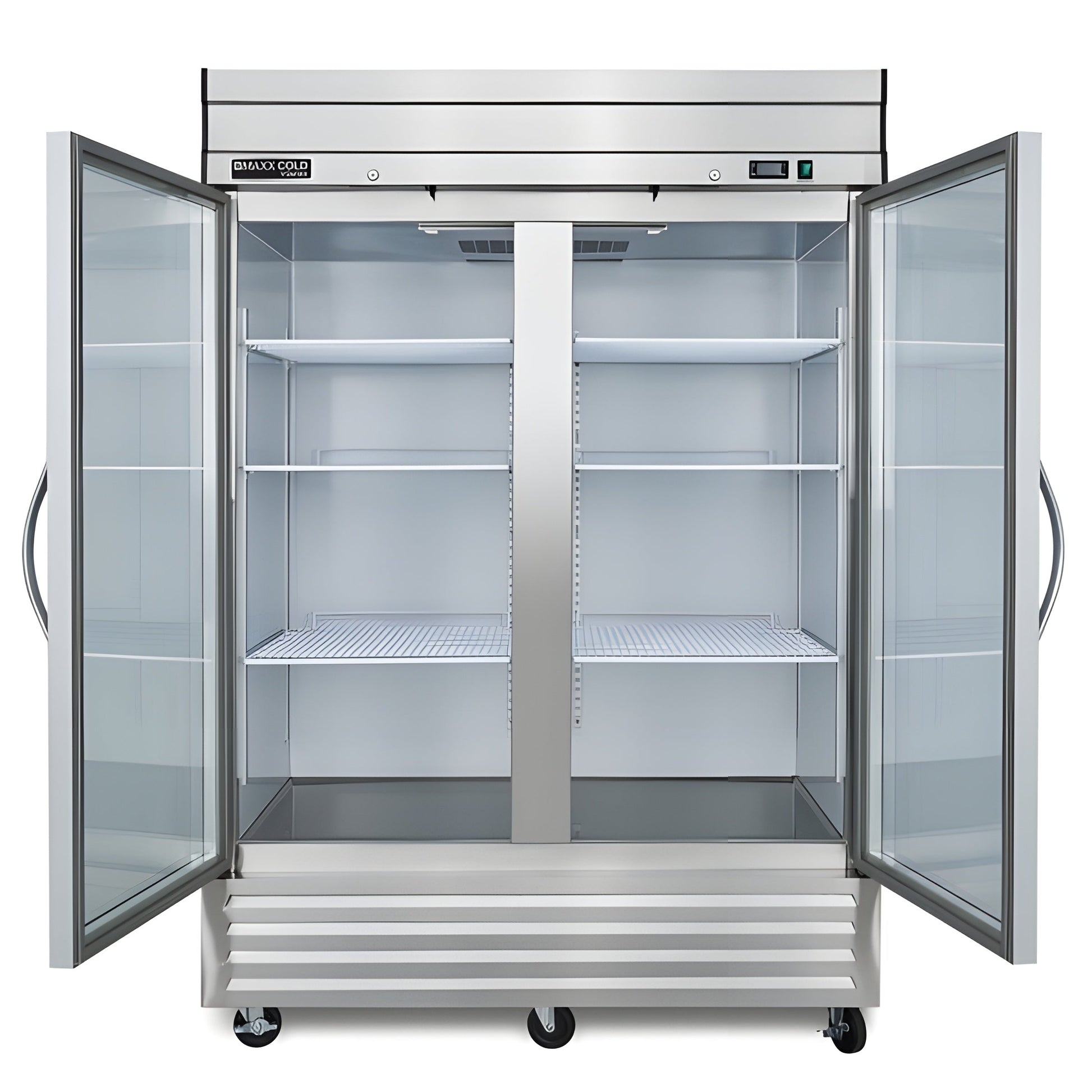 Ideal for showcasing your goods in restaurants, cafes, bakeries, catering businesses and more, the Maxx Cold V-Series 2 Glass Door Reach-In Refrigerator is a smart investment. Offering ample storage space for perishable goods, ingredients, prepared foods and beverages, this commercial reach-in refrigerator measures 54"W and has a storage capacity of 42 cubic feet. Built to withstand the demands of a commercial kitchen environment, it is constructed of a durable, easy-to-clean stainless steel exterior and painted aluminum interior. This reach-in refrigerator has two self-closing, locking, dual-pane glass doors with easy-to-grip handles, and the unit's open door alert beeps when the door has been open for three minutes. The transparent doors create an attractive display that enhances product visibility, promotes impulse purchases and makes it easier to locate items. Eight adjustable heavy-duty wire shelves let you efficiently organize and store food and beverage items. The unit has an easily accessible bottom mount for cleaning and is equipped with 4-inch swivel casters for easy mobility in your commercial kitchen. The digital control system lets you easily adjust the temperature with the range of 34°F to 40°F (1°C to 4°C), and the LED temperature display is easy to read. This double-door reach-in refrigerator features automatic interior lighting, an automatic defrost system and urethane foam insulated walls. The unit is equipped with an integrated condensate evaporator; therefore, no drain line connection is needed. Investing in the Maxx Cold V-Series 2 Glass Door Reach-In Refrigerator is a practical and essential decision for businesses in the foodservice industry. Covered by the Maxx Cold Six-Month Parts and Labor Limited Warranty.