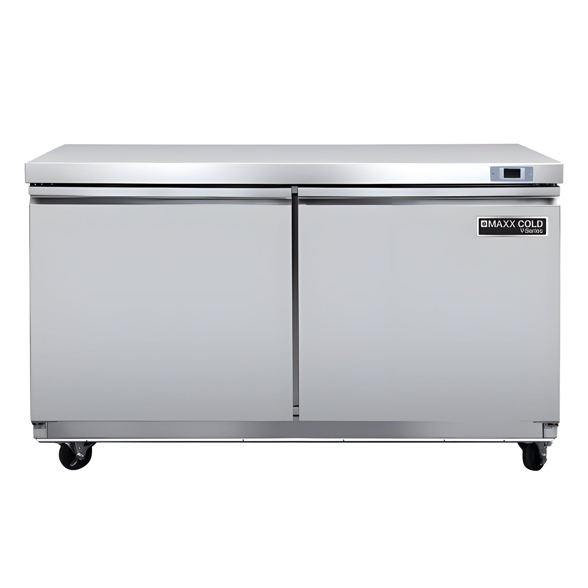 The Maxx Cold V-Series 2 Door Undercounter Refrigerator provides convenient refrigerated storage without sacrificing valuable floor space in your commercial kitchen. This compact undercounter refrigerator features a stainless steel exterior and powder coated aluminum interior for durability and ease of cleaning. Measuring 48 inches wide, it offers 14.1 cubic feet of storage and has two doors with easy-to-grip recessed handles. This stainless steel undercounter refrigerator has two adjustable heavy-duty wire shelves for storing and organizing chilled foods and ingredients such as vegetables, fruit, meat and more. With its compact size, this commercial undercounter fridge easily fits under counters and other workspaces, making it ideal for kitchens with limited space. The unit includes four 3" swivel casters (two with brakes) for easy mobility and cleaning. Additional features include a solid state digital control system, LED temperature display, and urethane foam insulated walls and doors. The unit has a temperature range of 33°F to 40°F to hold your chilled products at their ideal storage conditions. The condensate evaporator is integrated to the unit, meaning no drain line connection is needed. The Maxx Cold V-Series 2 Door Undercounter Refrigerator offers quick access to refrigerated ingredients, making it a valuable addition for restaurants, pizzerias, bars, bakeries, cafes and more. Covered by the Maxx Cold Six-Month Limited Warranty.