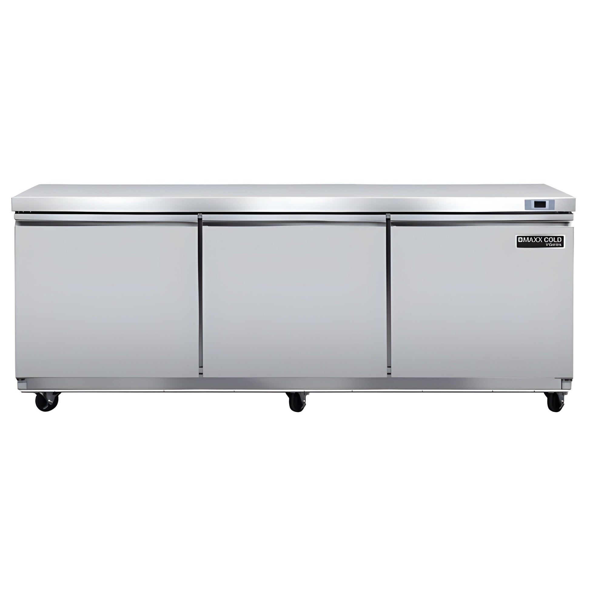 The Maxx Cold V-Series 3 Door Undercounter Refrigerator provides convenient refrigerated storage without sacrificing valuable floor space in your commercial kitchen. This compact undercounter refrigerator features a stainless steel exterior and powder coated aluminum interior for durability and ease of cleaning. Measuring 72 inches wide, it offers 21.8 cubic feet of storage and has three doors with easy-to-grip recessed handles. This stainless steel undercounter refrigerator has three adjustable heavy-duty wire shelves for storing and organizing chilled foods and ingredients such as vegetables, fruit, meat and more. With its compact size, this commercial undercounter fridge easily fits under counters and other workspaces, making it ideal for kitchens with limited space. The unit includes four 3" swivel casters (two with brakes) for easy mobility and cleaning. Additional features include a solid state digital control system, LED temperature display, and urethane foam insulated walls and doors. The unit has a temperature range of 33°F to 40°F to hold your chilled products at their ideal storage conditions. The condensate evaporator is integrated to the unit, meaning no drain line connection is needed. The Maxx Cold V-Series 3 Door Undercounter Refrigerator offers quick access to refrigerated ingredients, making it a valuable addition for restaurants, pizzerias, bars, bakeries, cafes and more. Covered by the Maxx Cold Six-Month Limited Warranty.