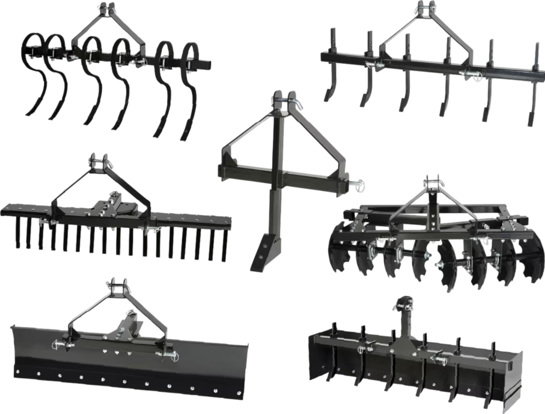 A: The kit includes essential tools such as a plow, cultivator, disk harrow, mower, landscape rake, and more, all designed to improve productivity for small to medium-sized farming or landscaping projects.