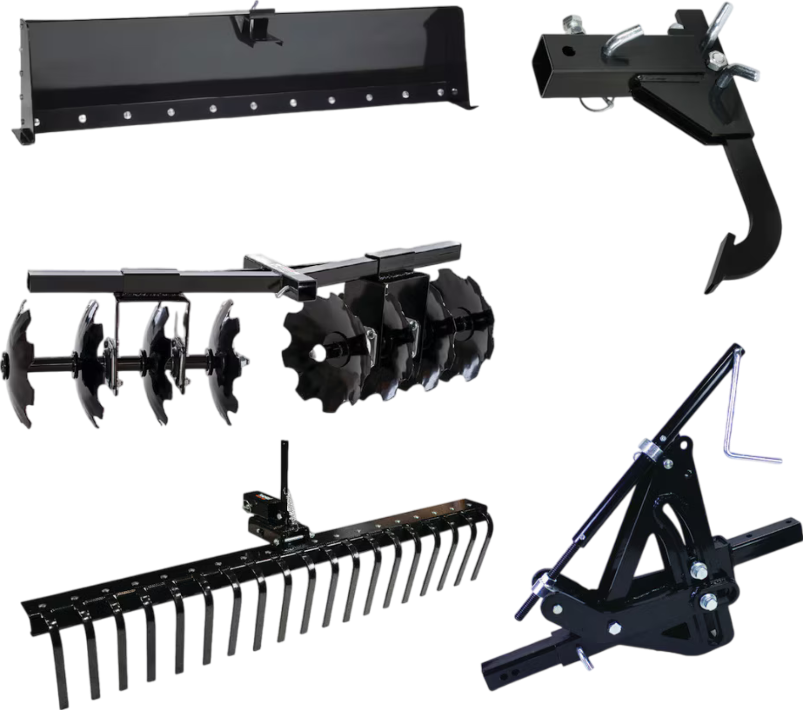 A: This five-piece hydraulic attachment system is designed for ATVs, UTVs, and small tractors, offering enhanced efficiency for farming, landscaping, and soil preparation.