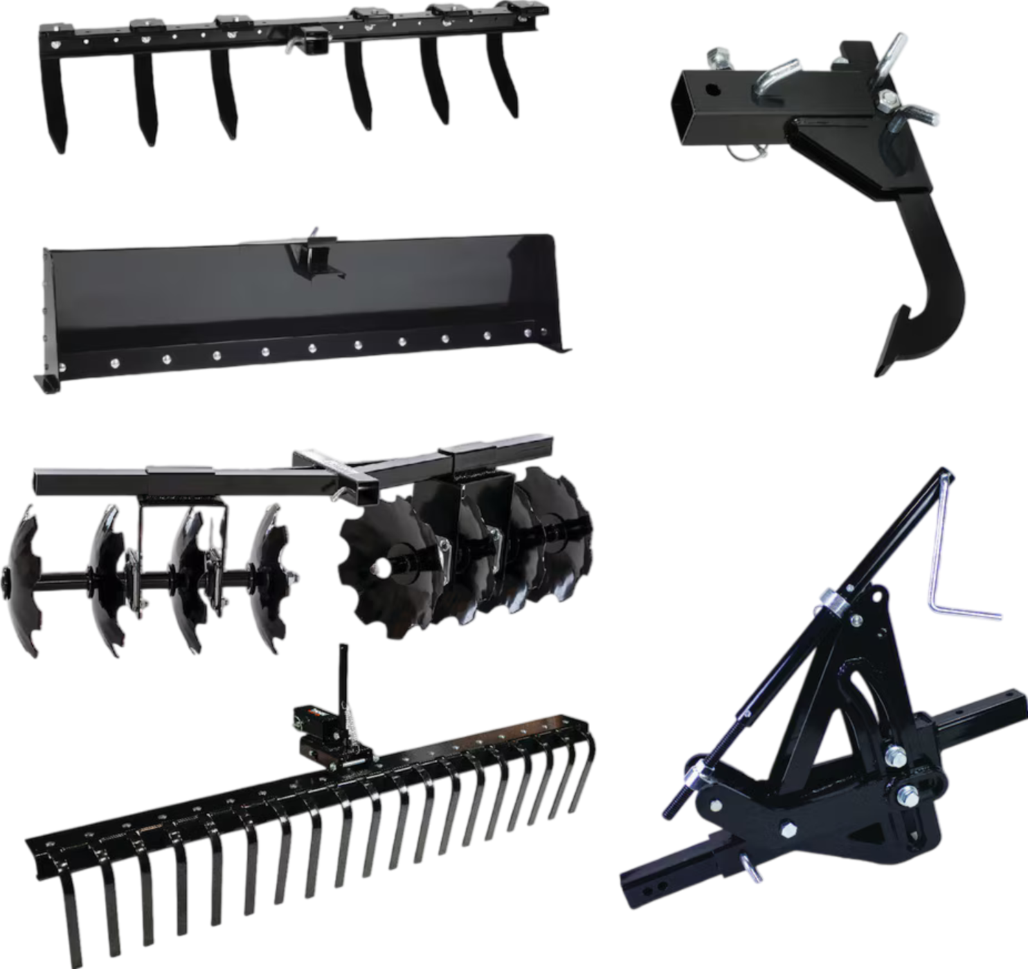 Get six Impact Implements together to create one amazing hydraulic system and save money versus buying each individually. This agricultural kit includes the 1-point hydraulic lift system, cultivator, grading blade with box ends, rake with tipper latch, middle buster, and disc plow harrow.
