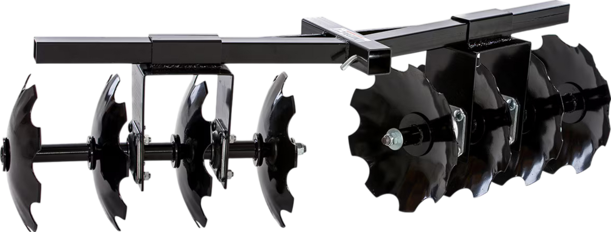The disc plow harrow is a must-have multi-functional accessory for ATV, UTV, SxS, garden tractor, and lawn tractor owners. With eight 12" notched, hardened steel, cutter disc blades, this tool repeatedly slices the ground and loosens dirt, making it perfect for chopping up unwanted weeds or crop remainders. With two sets of four discs providing 54" of cutting width, a stable axle, and a 15° blade angle of attack, this plow/harrow is designed for maximum efficiency and performance with an easy one-pin mounting system.