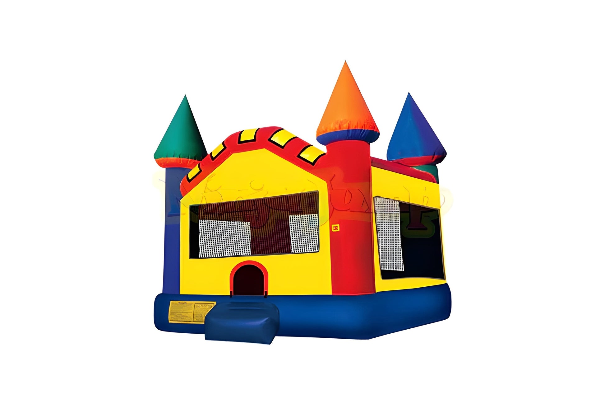 This large Castle moonwalk is 360-degrees of brilliant and joyful regal fun for all young royalty! This majestic moonwalk is fit for any king or queen, with colors of blue, green, red, yellow and orange, along with four tall spires to make any palatial party a success. Promote healthy activity and entertainment with easy set up and safe jumping in this one-of-a-kind moonwalk. Kids will have a grand time ruling and making friends in the Castle large moonwalk, which also is available in a modest medium size, only from Ninja Jump.