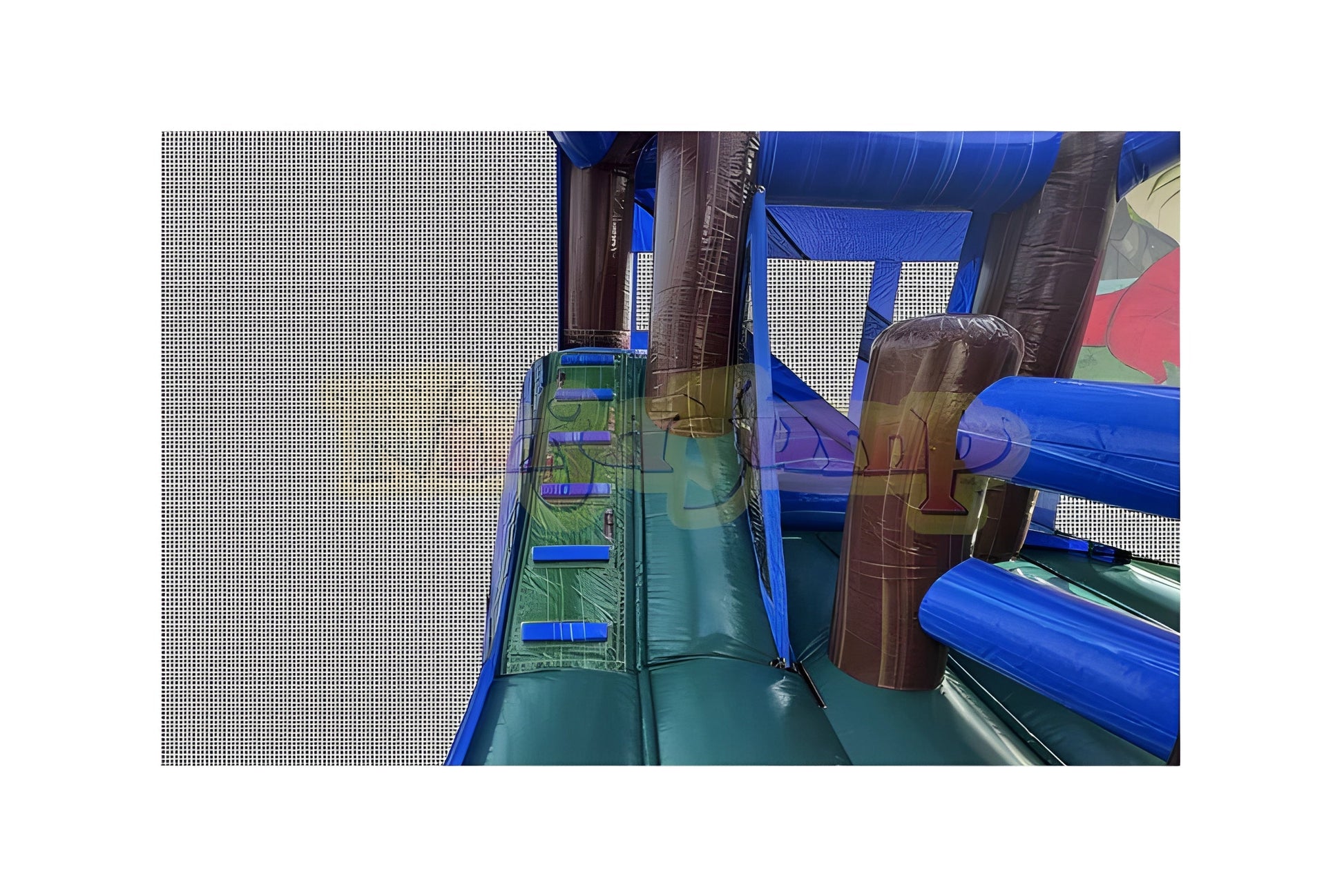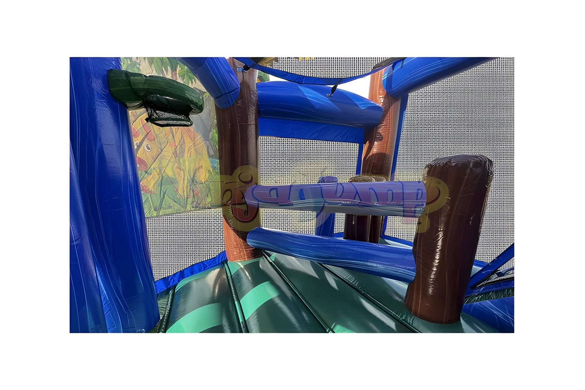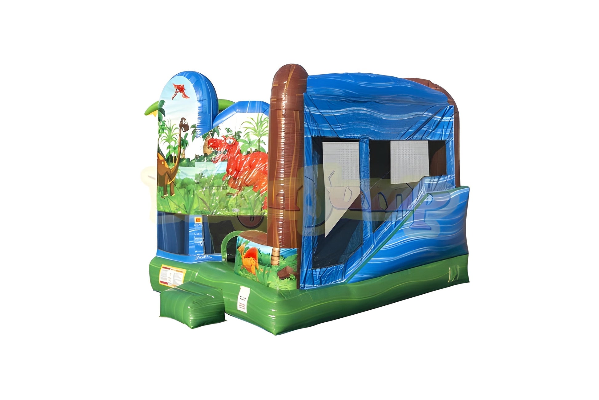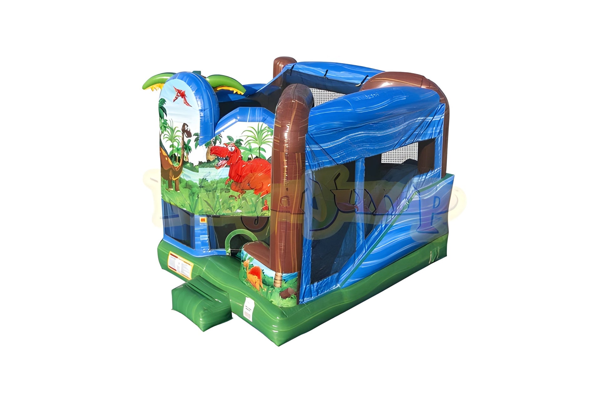 The combo unit offers a spacious jumping area, a slide for added excitement, a basketball hoop for interactive play, and both log and pop-up obstacles, all within a vibrant dinosaur theme.