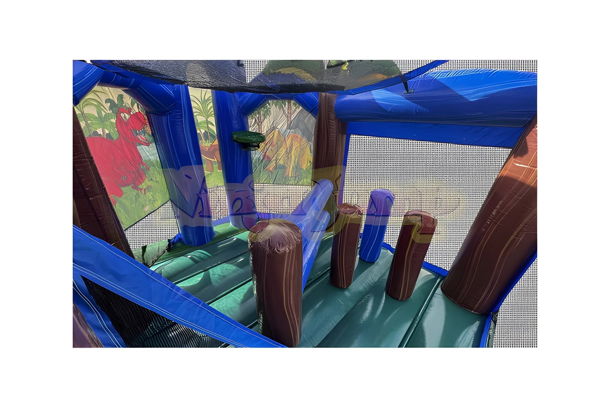 A vibrant, dinosaur-themed inflatable combo unit featuring a bounce house, slide, basketball hoop, and both log and pop-up obstacles. Designed for both wet and dry use, it offers versatile entertainment for various events and parties.