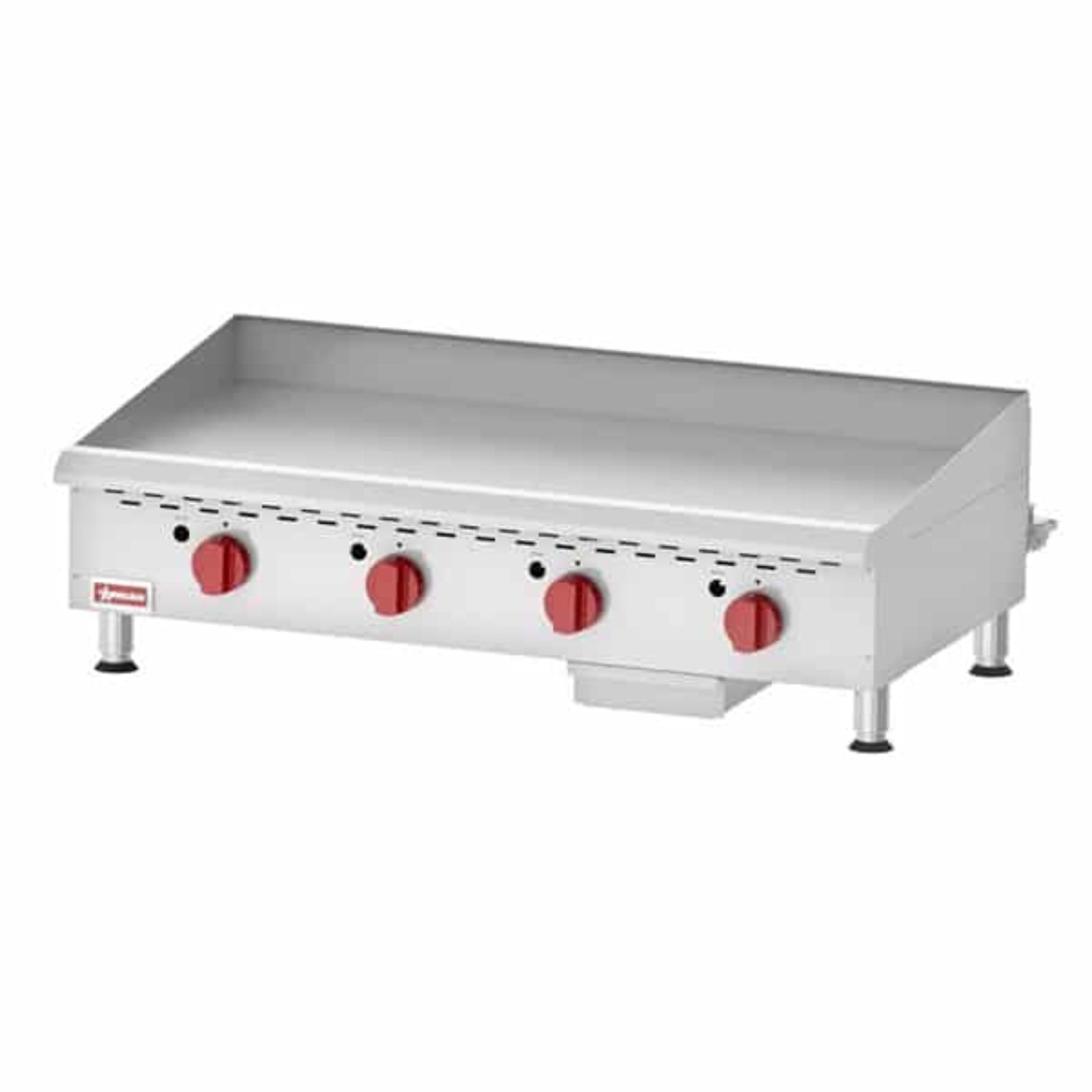 Fueled by natural gas, this kitchen marvel boasts an expansive 48"W x 20"D cooking area and a robust 3/4" thick polished steel griddle plate. With (4) stainless steel burners and thermostatic control, you have the tools to achieve griddle greatness.