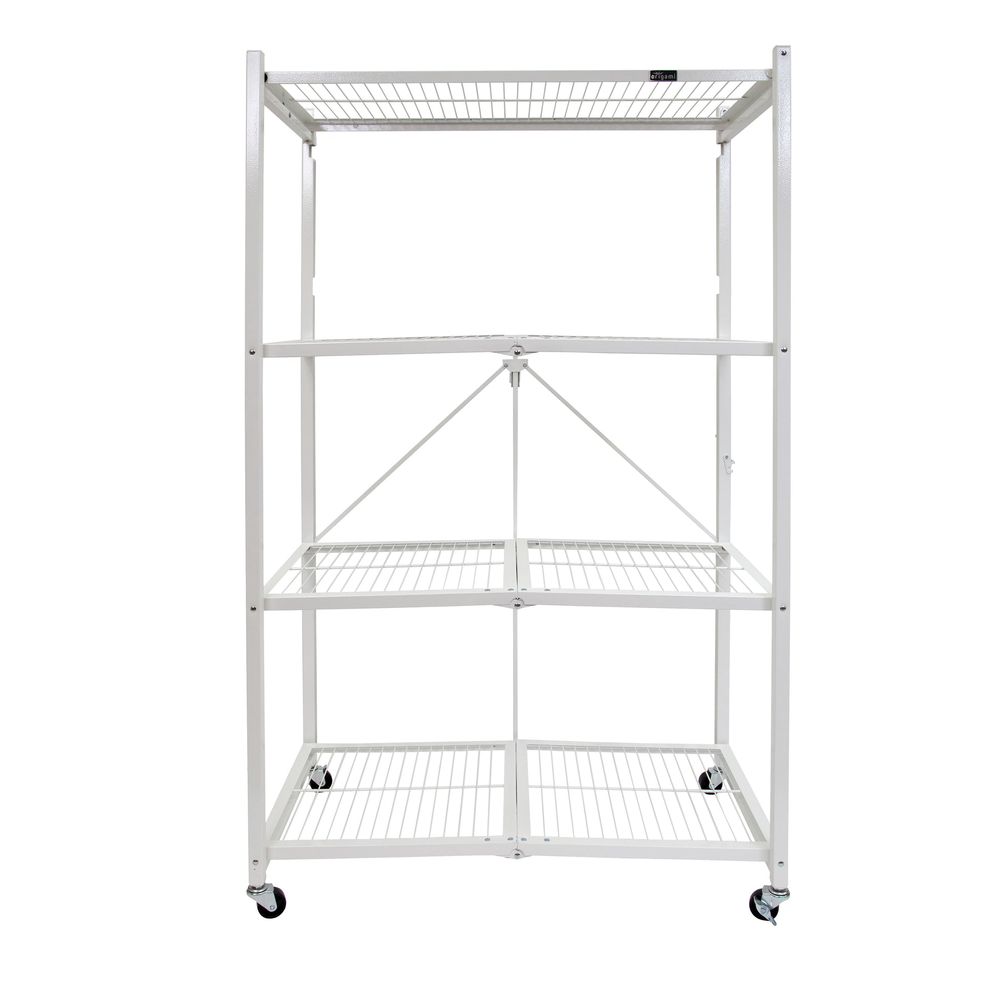 These versatile and robust multipurpose storage units from Origami are a must-have organizational solution for every modern home. With their sleek finish, the R5 Folding 4-Tiered Shelf Storage Racks on Wheels seamlessly blend into any living space and offer an efficient and convenient way to declutter your surroundings.Designed with spacious shelves and made from commercial-grade powder-coated steel, these 4-tiered organization and storage rack ensures optimal storage for your belongings. For added convenience and mobility, the shelving unit includes 4 caster wheels. Without wheels on the rack, these shelf organizers can hold up to 750 pounds (250 pounds per shelf), while they can hold up to 225 pounds (75 pounds per shelf) with wheels. Boasting both durability and optimal functionality, these foldable garage shelving units have multiple tiers to accommodate a wide range of household items. These shelving units are built for convenience and reliable storage, suitable for garages, warehouses, offices, basements, classrooms, and more. Use them for bathroom storage, laundry room organization, as a closet organizer cart, open pantry and kitchen storage, or as a bookshelf in the living room.Best of all, these rolling carts require no tools or lengthy assembly time. To set up, unfold the wire shelving frame, flip the top shelf down, and secure the patented Origami connection clip. You're ready to store bins and boxes in just about 20 seconds! Simply fold the storage carts flat when not in use.When it's time to tidy up, declutter, or you want to add a display shelf for home decor, Origami has the versatility you need. Take on any storage and organization task with confidence using the R5 Foldable 4-Tier Storage Racks on Wheels.
