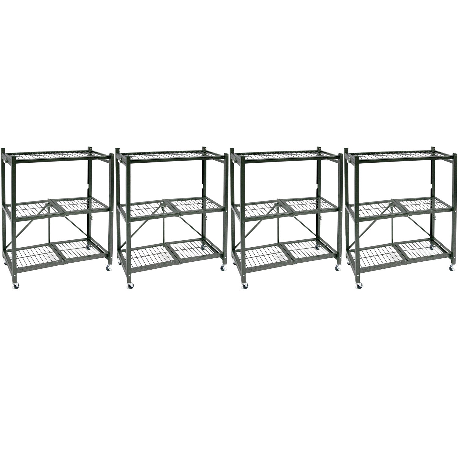 Declutter your life and add a little more organization to your home or workspace with this 4-pack of the Origami R3 General Purpose Foldable 3-Tiered Shelf Storage Rack.This 3-tiered storage shelf is made from heavy-duty, commercial-grade powder-coated steel and includes 4 caster wheels that help with mobility. Durability is important, but so is functionality, and that's why this model has 3 different shelves. Without wheels on the rack, this shelf can hold a whopping 750 pounds and with the wheels, it can hold 225 pounds. Use this shelving unit for a wide variety of uses like as a way to tidy up/organize your garage, warehouse, office, basement, and more.Best of all, this entire system requires no tools or lengthy assembly time. This foldable shelf opens and unfolds in just 5 seconds and is ready to go when you are.