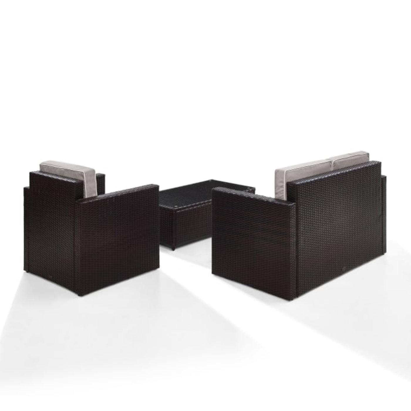 Q: What is included in the Crosley Palm Harbor 3pc Outdoor Wicker Conversation Set?