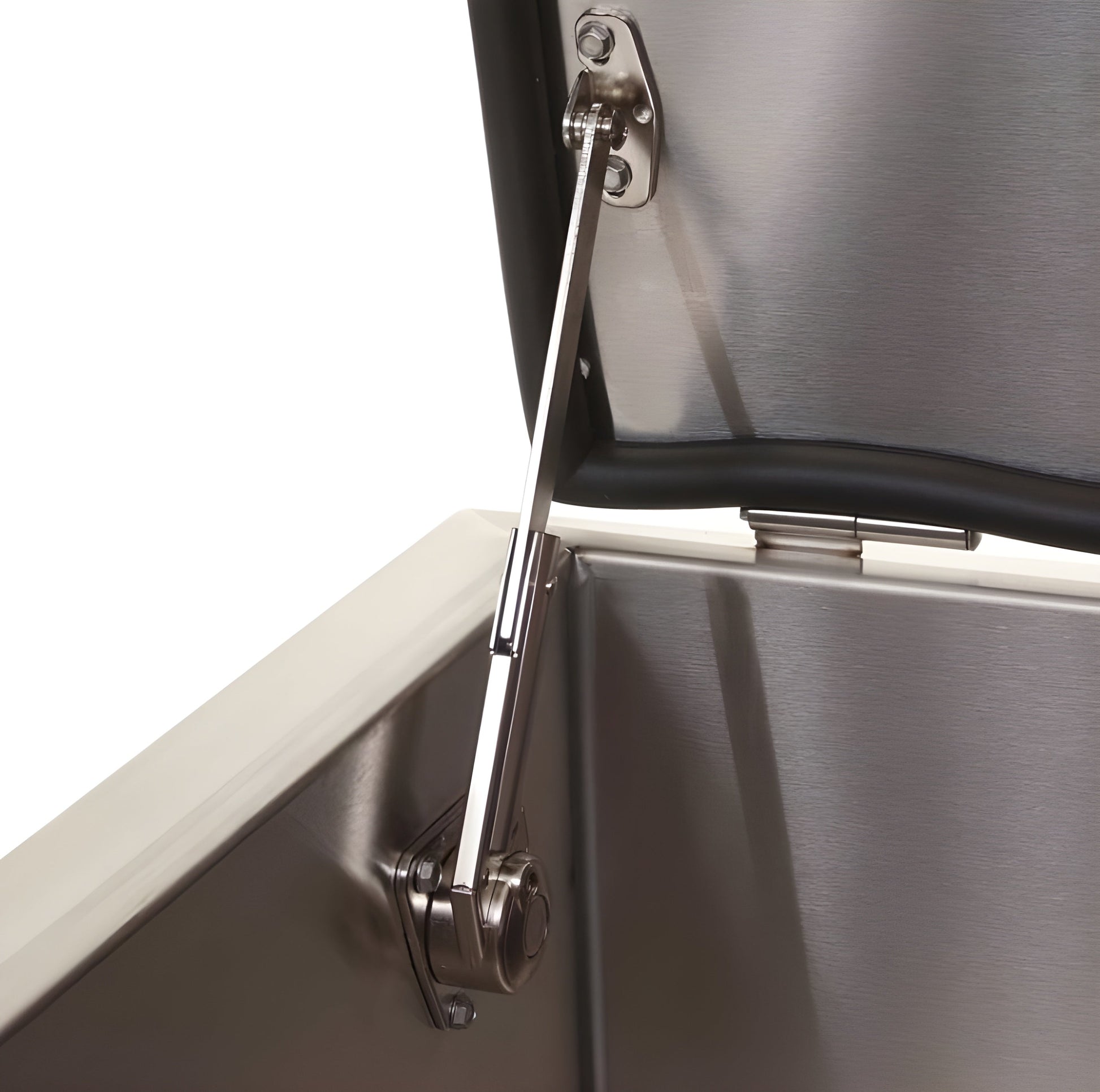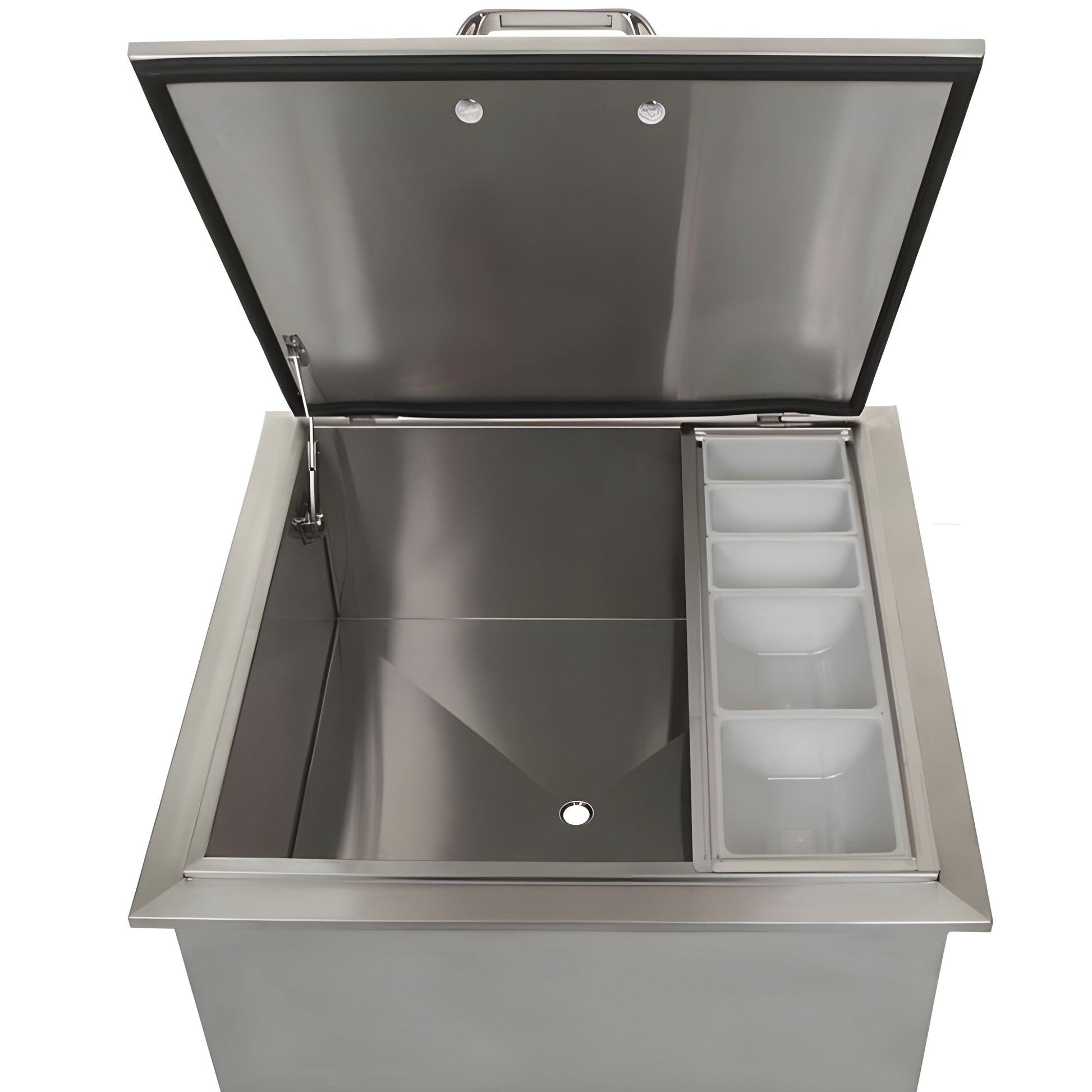 This Drop-In Ice Bin Cooler With Condiment Holder is the perfect addition to any outdoor kitchen. Unit features commercial 304 grade, 20 gauge stainless steel construction (including hinges, handles, and frame); removable condiment holder; external flag hinges for easy removal; threaded drain hole in center of bin; fully welded and blended corners; and a number 4 brushed finish.