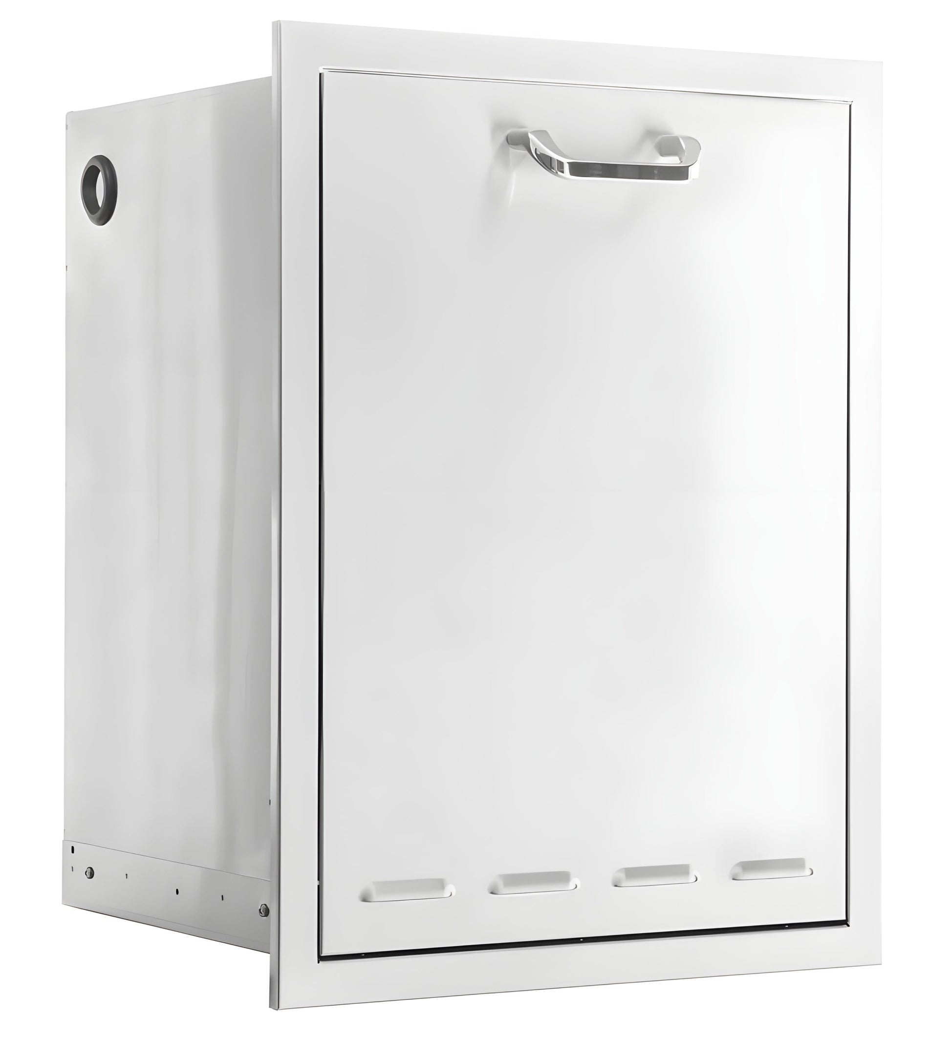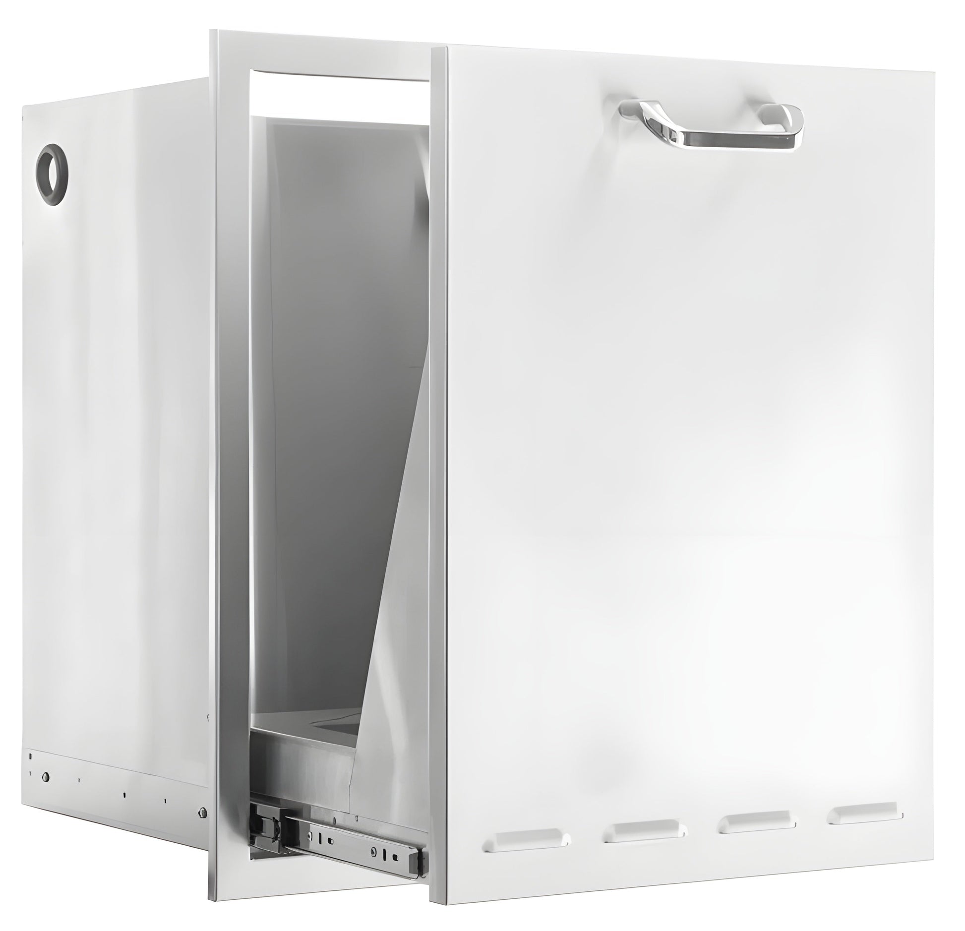 This PCM 20-Inch stainless steel roll-out trash or propane tank drawer is constructed with a 20 gauge 304 stainless steel frame and number 4 brushed finish. The roll out tray uses heavy-duty, commercial grade ball bearing drawer glides with full length tracks for easy opening and closing and is flush mounted for a streamlined appearance. A 42 quart trash bin is also included.