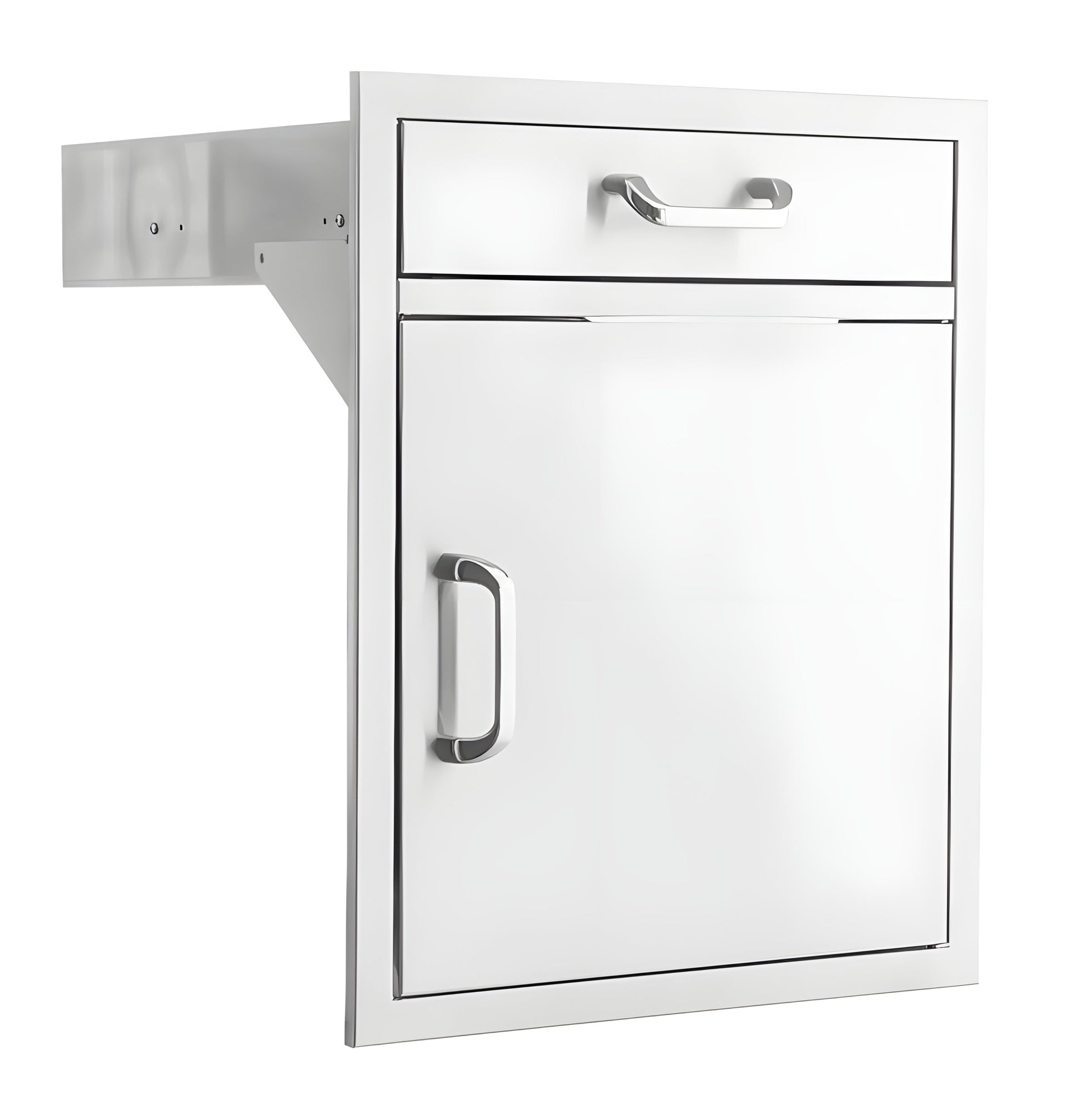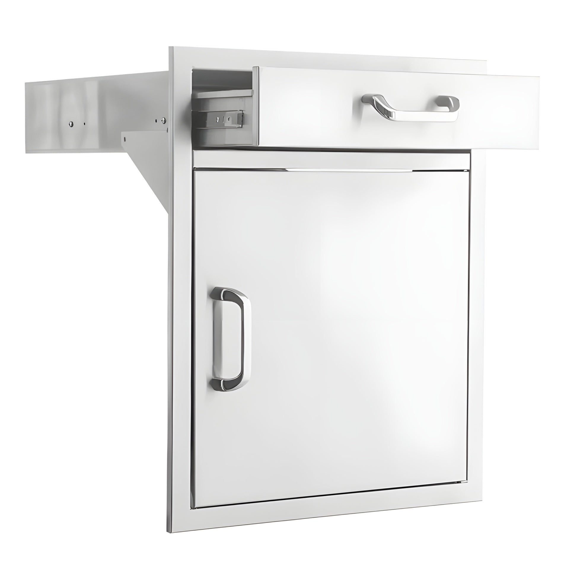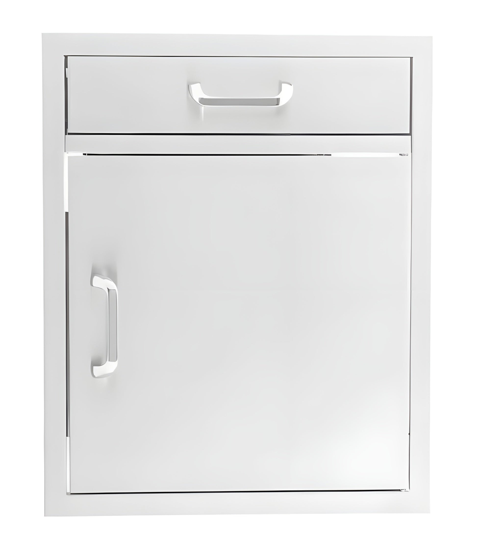 The PCM 260 series 21" Right Hinged door and drawer combination features commercial 304 grade, stainless steel construction, heavy duty commercial grade ball bearing drawer glide; full length drawer track; a 20 gauge steel frame; external flag hinges for easy removal; and a number 4 brushed finish. Door frame is flush-mounted. Single access door is the perfect outdoor kitchen accessory for any outdoor BBQ island.