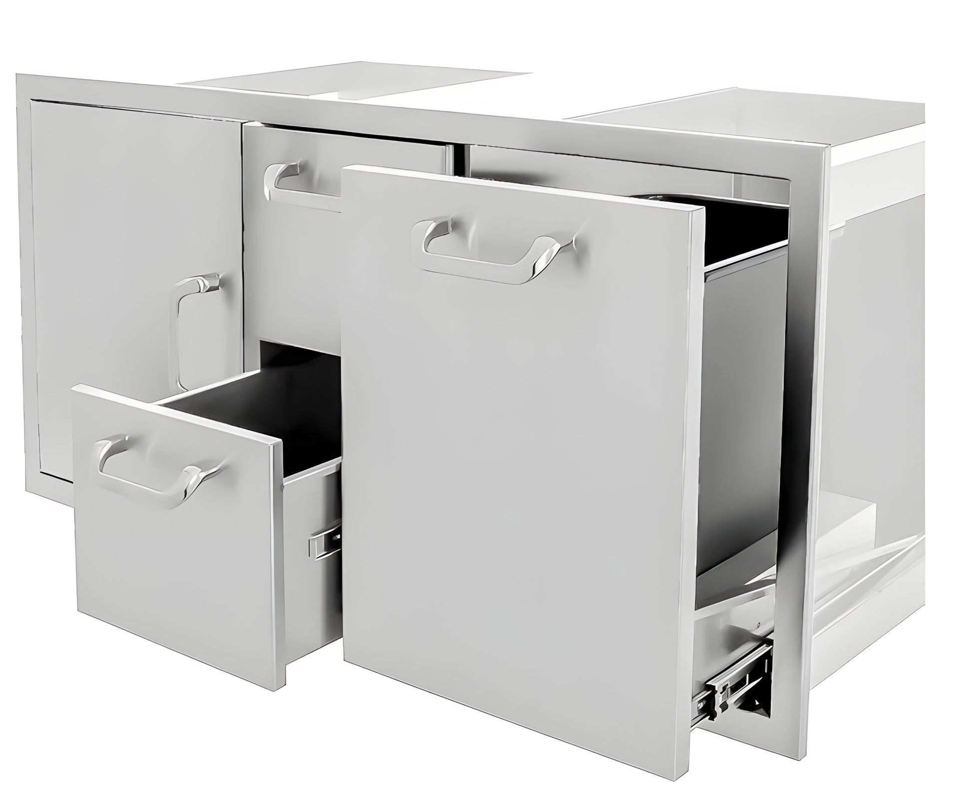 The PCM 260 Series 32-Inch Double Drawer & Roll-Out Trash/Propane Bin On Right Combo is made with a 20 gauge 304 stainless steel frame with a number 4 brushed finish. These access drawers and door are flush mounted for a streamlined appearance, making for a perfect outdoor kitchen accessory for any outdoor BBQ island. It provides storage space and access to the underside of grills and side burners. This double-lined door adds additional structural integrity and the drawers use heavy-duty, commercial-grade ball bearings that glide on full-length drawer tracks for easy opening and closing.