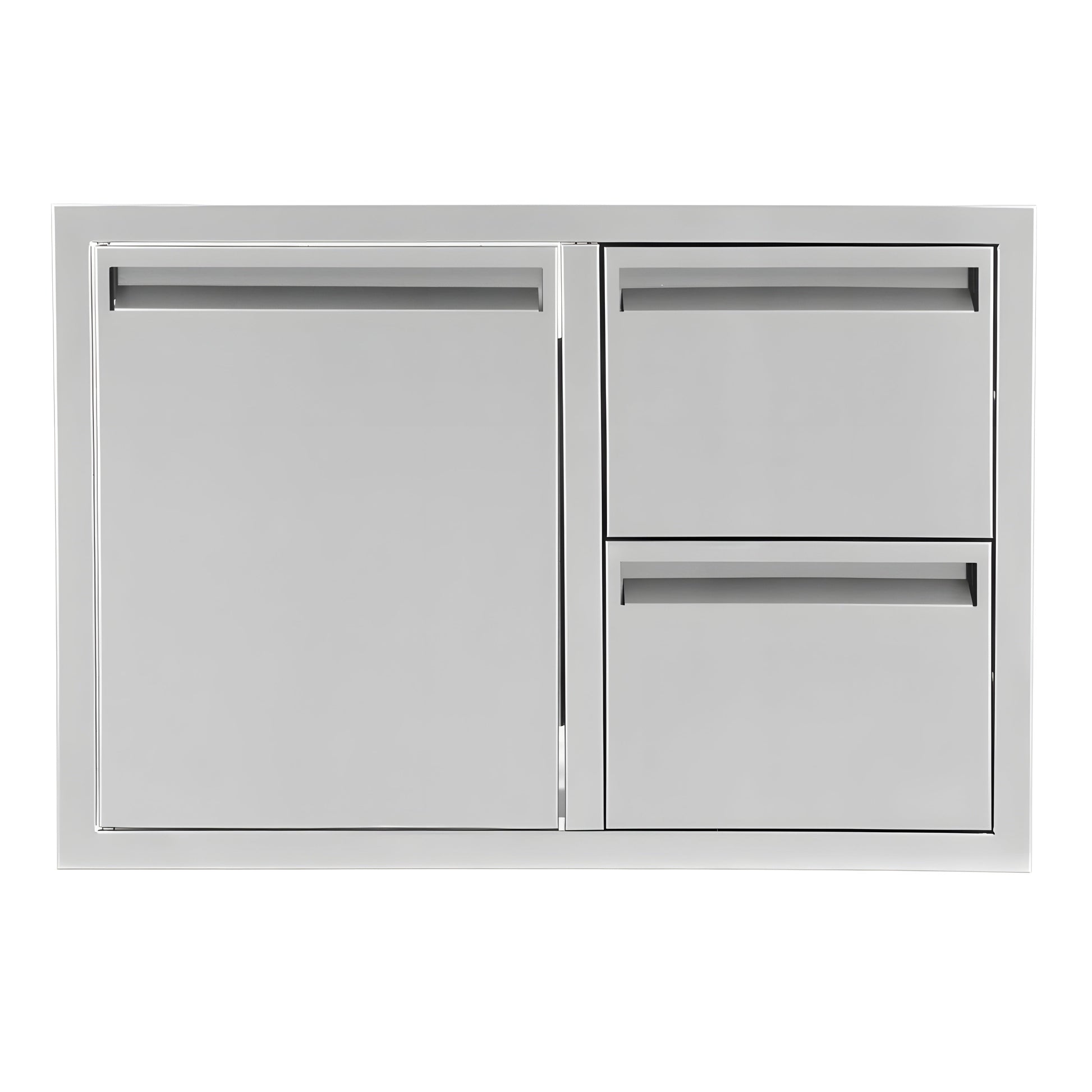 The PCM 350 Series 32-Inch Access Door & Double Drawer Combo (Reversible) is made with a 20 gauge 304 stainless steel frame with a number 4 brushed finish. Its welds are gound and blended to help create a complete look. This combo is the perfect addition to your outdoor kitchen.
