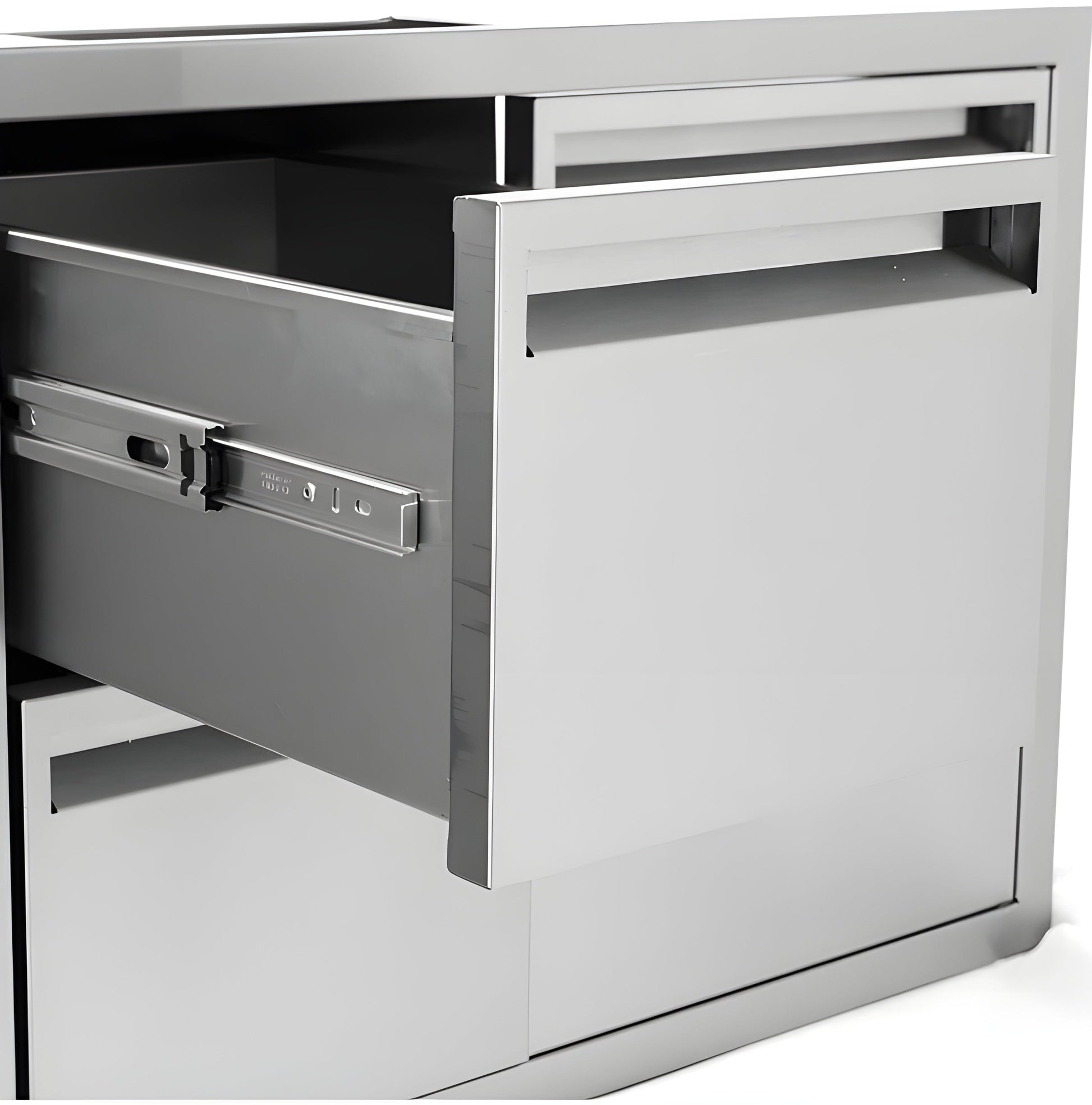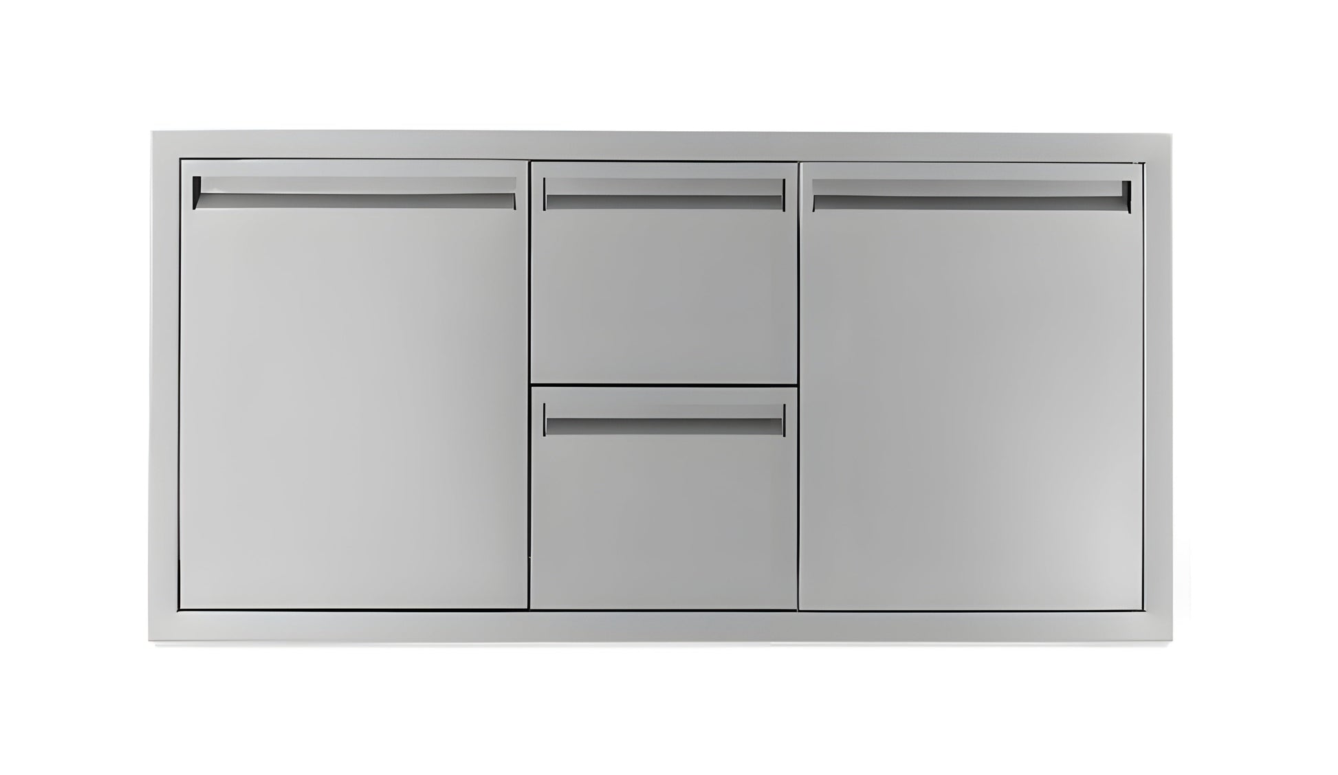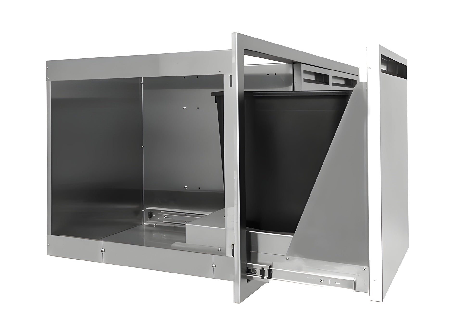 This PCM 42-Inch stainless steel door, double drawer & roll-out trash bin combo is constructed with a 20 gauge 304 stainless steel frame and number 4 brushed finish. The unit is flush mounted for a streamlined appearance and a 48 quart trash can is also included. Drawers and roll-out trash bins glide easily on heavy duty tracks. An access door, drawer, and trash bin combo is the perfect outdoor kitchen accessory for any outdoor BBQ island, providing storage space and access to the underside of grills and side burners.