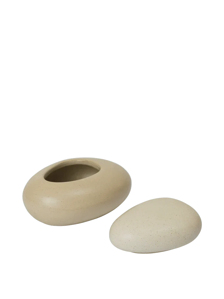 The Ferm Living Pebble Box captures the organic beauty of nature, inspired by the smooth, rounded forms of coastal pebble stones. Crafted from glazed ceramic, it showcases a polished surface that enhances its refined and calming aesthetic. The design mimics the effortless balance of stacked stones, bringing a sense of harmony and tranquility to any space.