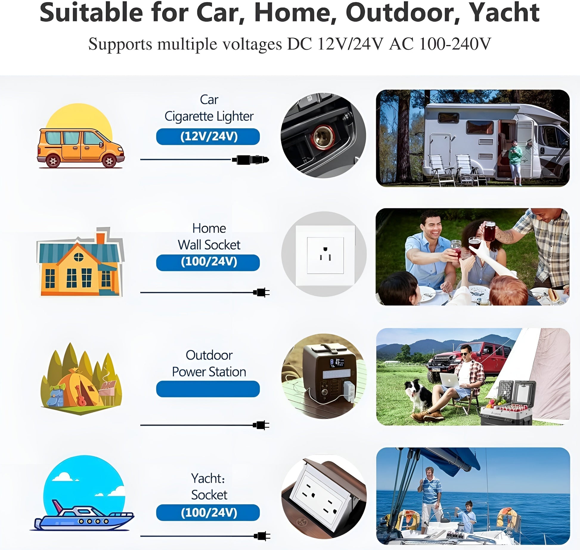 Multiple Power Options – Works with 12V DC for vehicles and 110-240V AC for home use, providing versatility for use in cars, RVs, and even at home.