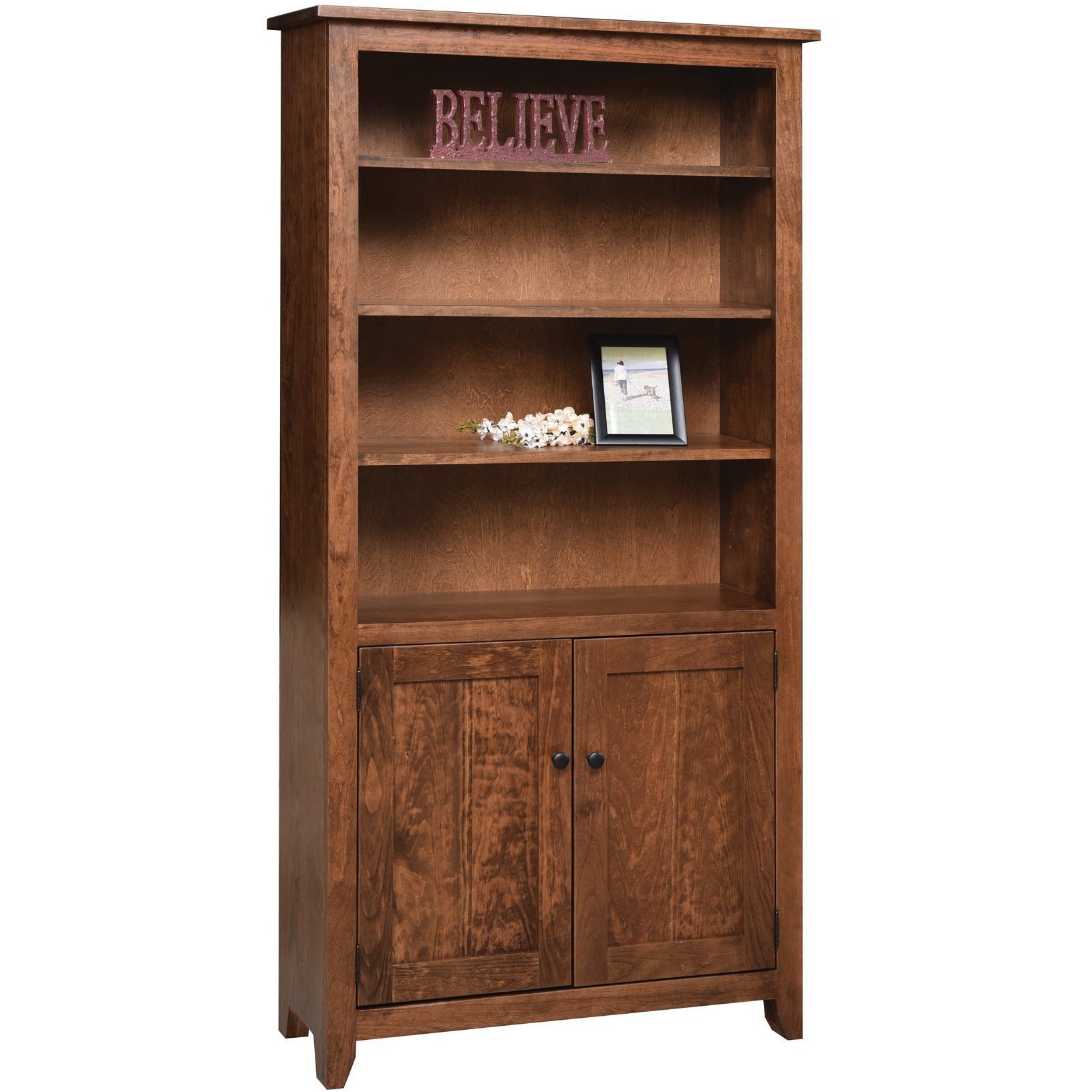 A: It is a solid wood bookcase with doors, designed for organized storage and display in home or office settings.