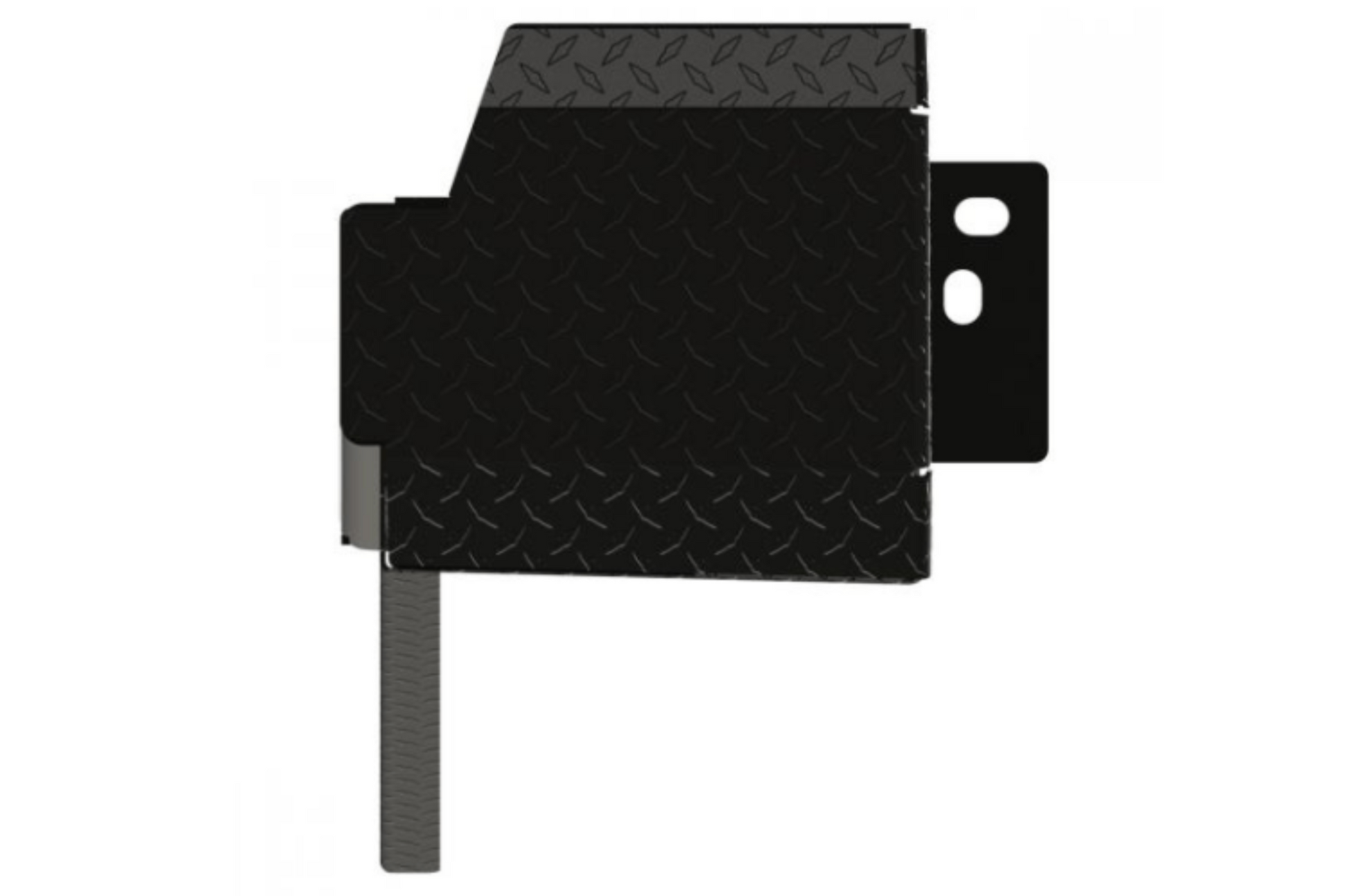 A: Made from 12-gauge diamond-plate steel with a fully welded, frame-mounted design for durability and strength.