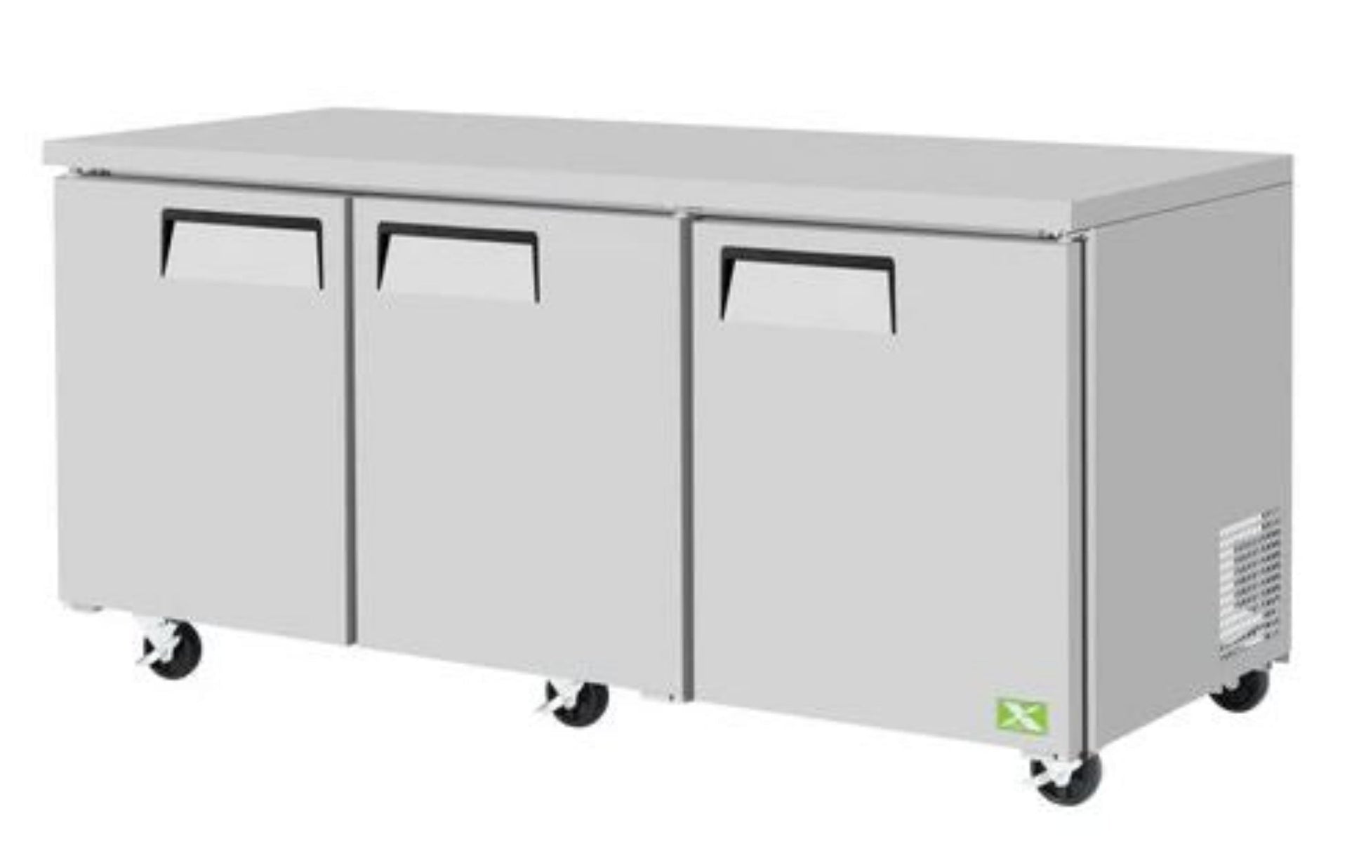 Refrigeration X, Undercounter Refrigerator, two section, 72-3/4"W x 30"D x 30-3/8"H, 18.8 cu.ft., (3) solid doors with easy grip handles, (3) adjustable PE coated wire shelves, high-density polyurethane insulation, stainless steel exterior door, aluminum exterior side (galvanized steel back & bottom), self-contained system, R-600a Hydrocarbon refrigerant, 1/6 HP, 115v/60/1-ph, 5 amps, NEMA 5-15P, cETLus, ETL-Sanitation