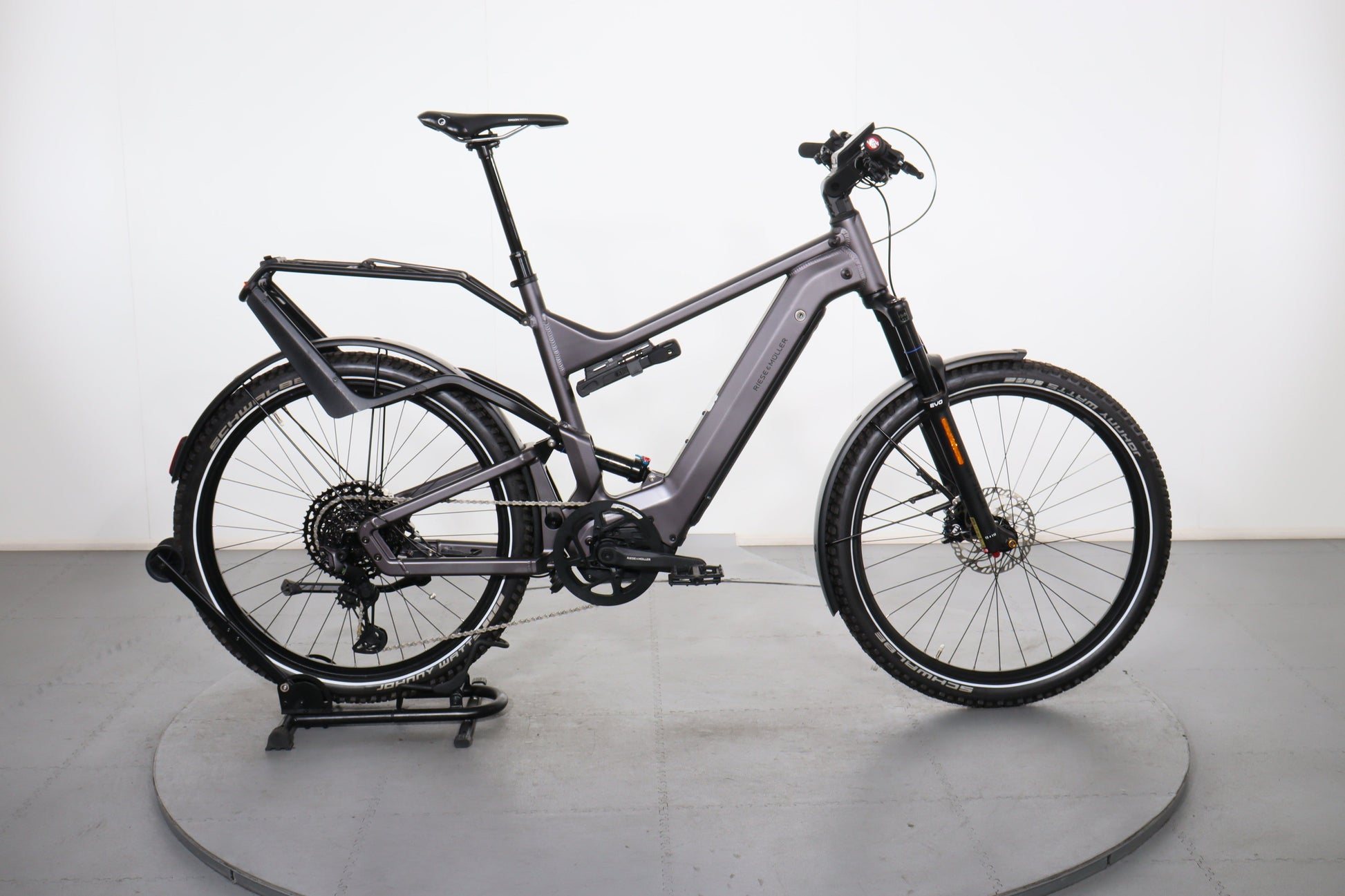 The Riese & Müller Delite GT Touring HS is a high-speed electric bike engineered for touring and daily commuting, combining comfort, power, and advanced features. It is equipped with a powerful motor that provides pedal assistance for effortless cruising at high speeds, making it ideal for both long-distance rides and urban commutes. The full-suspension setup ensures a smooth ride across different terrains, enhancing comfort during extended use. Additionally, the bike includes integrated lights, a rear rack, and a comfortable riding position, making it a well-rounded choice for those seeking a reliable and efficient e-bike.