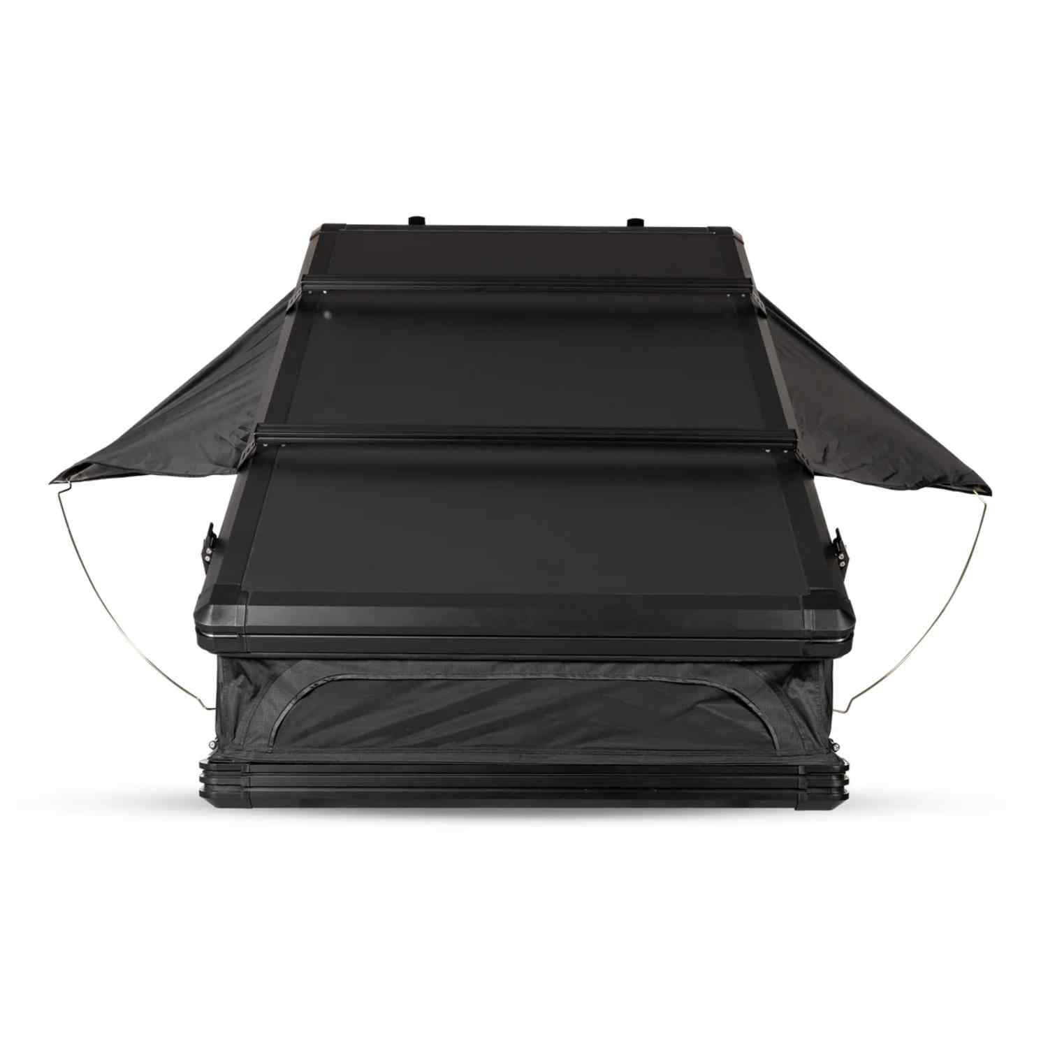 A: Faster setup (seconds/minutes instead of lengthy assembly), better weather resistance, more robust protection from wind/rain/debris, and a lower profile on the roof compared to soft‑shell tents.