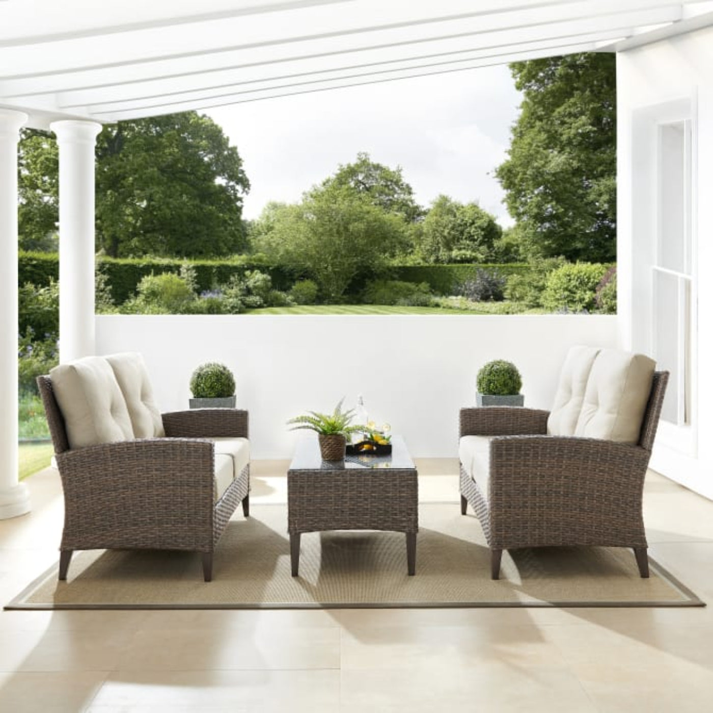 A: Its neutral oatmeal cushions and woven wicker design fit coastal, transitional, and modern outdoor décor.