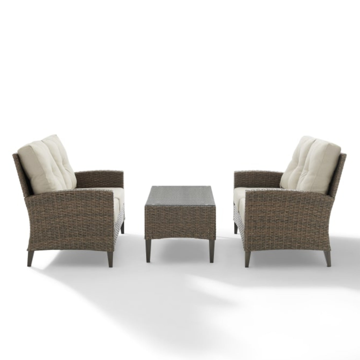 Great for entertaining or lounging with friends, the Rockport 3pc Conversation Set features two loveseats and a coffee table made of all-weather resin wicker over powder-coated steel frames. The coffee table is topped with tempered glass, adding just the right amount of table space for resting a cool drink. All perched atop steel tapered legs hand painted to look like real wood, the Rockport conversation set brings classic style to your outdoor oasis without sacrificing durability.