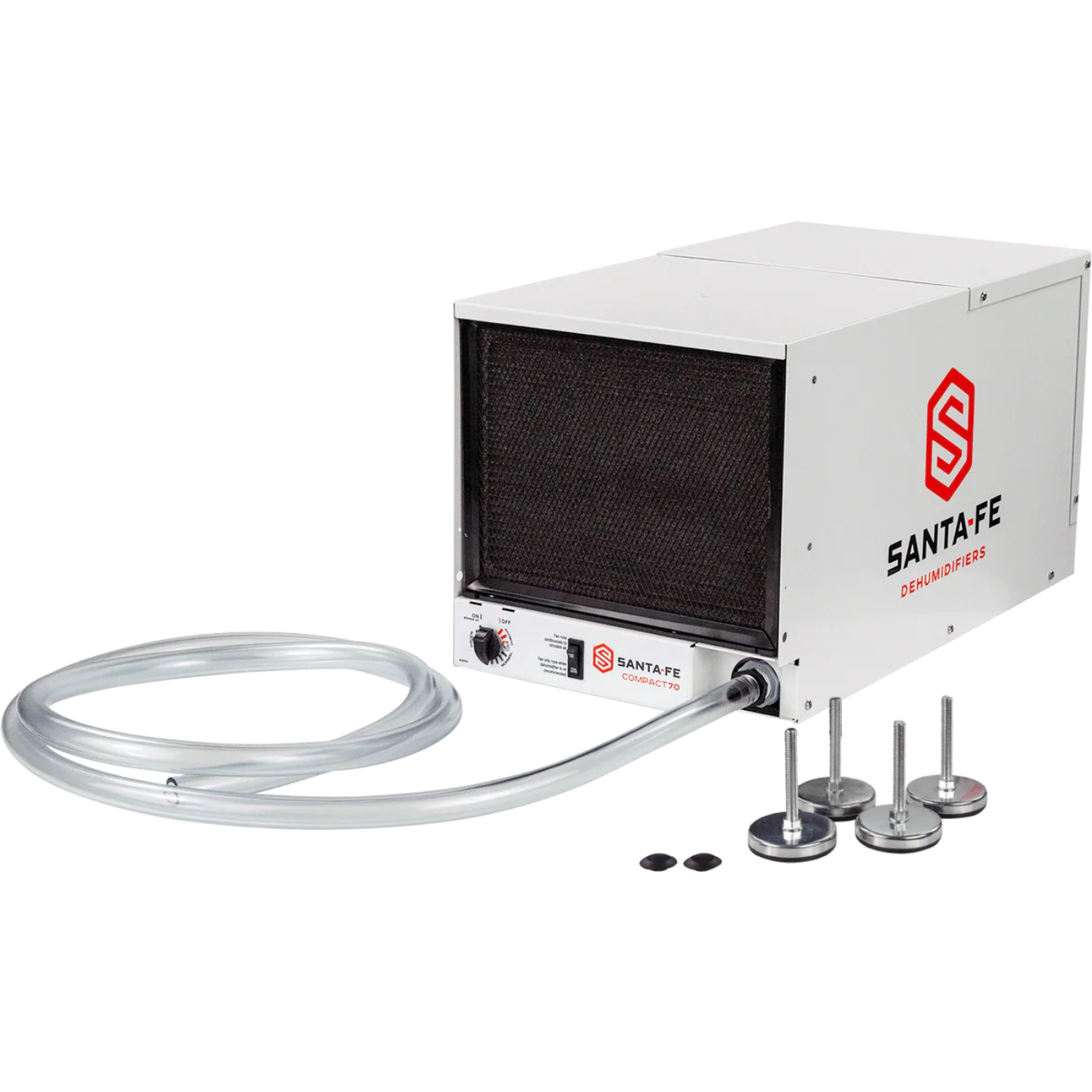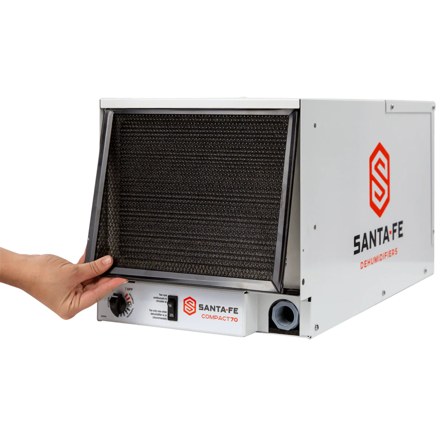 At just 55 pounds, 12 inches long, and 12 inches high, the Santa Fe Compact70 Dehumidifier is small enough to fit in crawl spaces and between floor joists while providing powerful dehumidification.