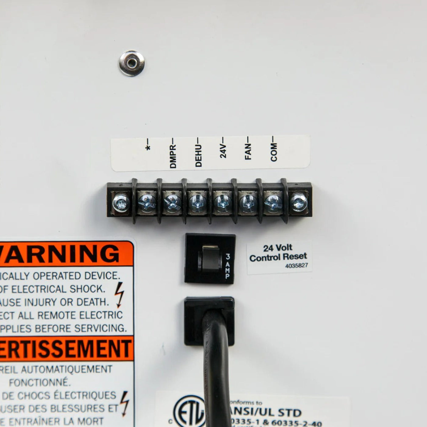 This dehumidifier must be controlled by a remote dehumidistat controller, which is sold separately. Therma-Stor offers several options. All the control units below are wired directly to the Ultra Series unit using 24-volt pigtail wiring.