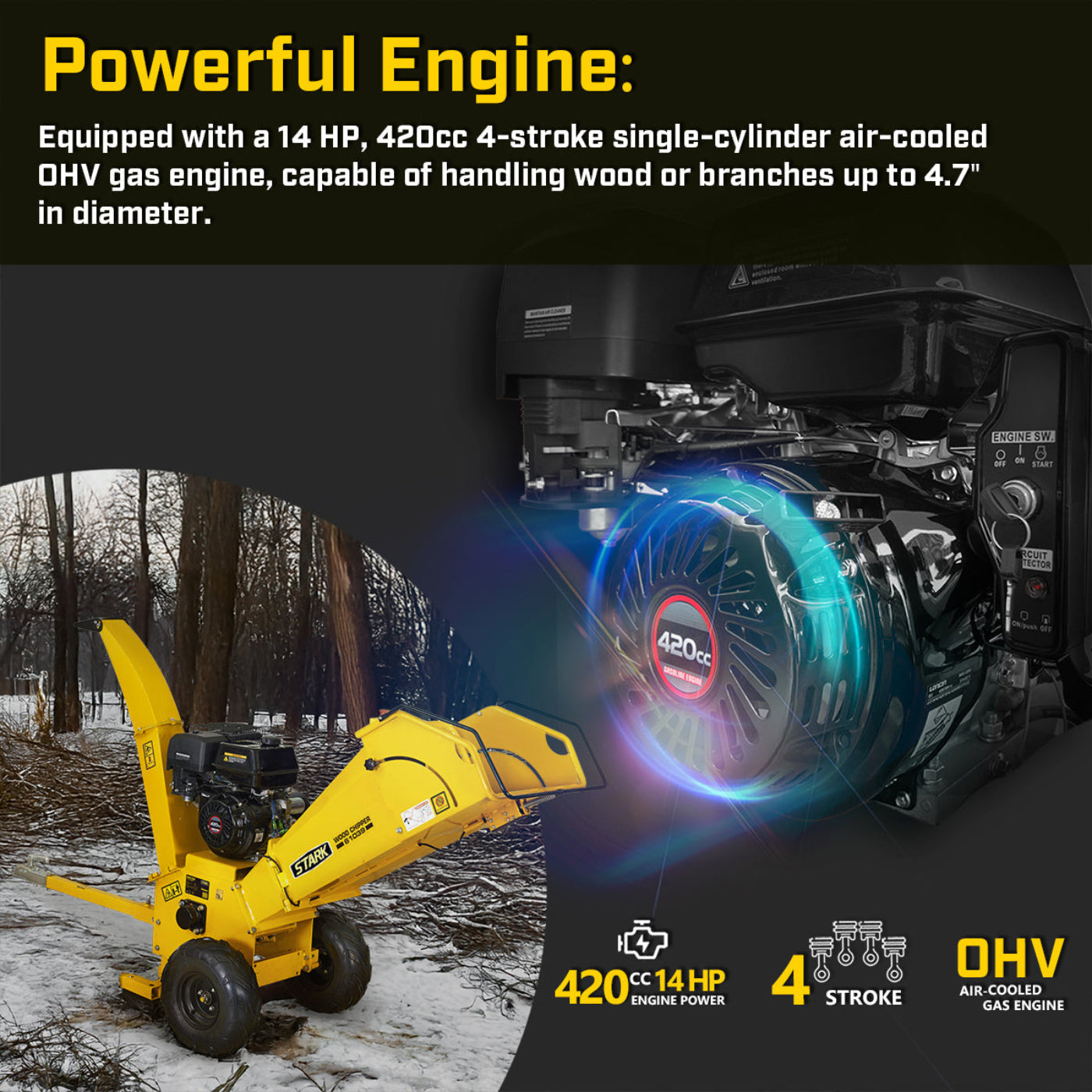 A: It is powered by a 14HP 420cc gas engine for high-performance shredding.